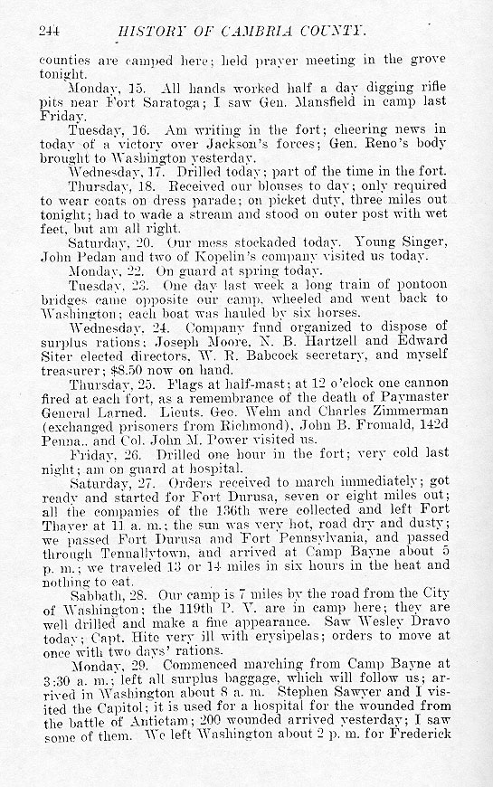 counties are encamped here; held prayer meeting in the grove tonight. Monday, 15. All hands worked half a day digging rifle pits near Fort Saratoga; I saw Gen. Mansfield in camp last Friday. Tuesday, 16. Am writing in the fort; cheering news in today of a victory over Jackson's forces; Gen. Reno's body brought to Washington yesterday. Wednesday, 17. Drilled today; part of the time in the fort. Thursday, 18. Received our blouses to day; only required to wear coats on dress parade; on picket duty, three miles out tonight; had to wade a stream and stood on outer post with wet feet, but am all right. Saturday, 20. Our mess stockaded today. Young Singer, John Pedan and two of Kopelin's company visited us today. Monday, 22. On guard at spring today. Tuesday, 23. One day last week a long train of pontoon bridges came opposite our camp, wheeled and went back to Washington; each boat was hauled by six horses. Wednesday, 24. Company fund organized to dispose of surplus rations: Joseph Moore, N. B. Hartzell and Edward Siter elected directors. W. R. Babcock secretary, and myself treasurer; $8.50 now on hand. Thursday, 25. Flags at half-mast; at 12 o'clock one cannon fired at each fort, as a remembrance of the death of Paymaster General Larned. Lieuts. Geo. Wehn and Charles Zimmerman (exchanged prisoners from Richmond), John B. Fromald, 142d Penna., and Col. John M. Power visited us. Friday, 26. Drilled one hour in the fort; very cold last night; am on guard at hospital. Saturday, 27. Orders received to march immediately; got ready and started for Fort Durusa, seven or eight miles out; all the companies of the 136th were collected and left Fort Thayer at 11 a. m.; the sun was very hot, road dry and dusty; we passed Fort Durusa and Fort Pennsylvania, and passed through Tennallytown, and arrived at Camp Bayne about 5 p. m.; we traveled 13 or 14 miles in six hours in the heat and nothing to eat. Sabbath, 28. Our camp is 7 miles by the road from the City of Washington; the 119th P. V. are in camp here; they are well drilled and make a fine appearance. Saw Wesley Dravo today; Capt. Hite very ill with erysipelas; orders to move at once with two days' rations. Monday, 29: Commenced marching from Camp Bayne at 3:30 a. m.; left all surplus baggage, which will follow us; arrived in Washington about 8 a. m. Stephen Sawyer and I visited the Capitol; it is used for a hospital for the wounded from the battle of Antietam; 200 wounded arrived yesterday; I saw some of them. We left Washington about 2 p. m. for Frederick |