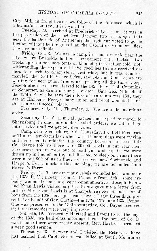 City, Md., in freight cars; we followed the Patapsco, which is a beautiful country; it is loyal, too. Tuesday, 30. Arrived at Frederick City 2 a. m.; it was in the possession of the rebel Gen. Jackson two weeks ago; it is near the battle field of Antietam; the regiment voted to go no further without better guns than the Ostend or Fremont rifles; they are not reliable. Friday, Oct. 3. We are in camp in a pasture field near the city, where Burnside had an engagement with Jackson two weeks ago; do not have tents or blankets; it is rather cold; notwithstanding the exposure I have good health; we received orders to march to Sharpsburg yesterday, but it was countermanded; the 133d P. V. are there; saw Oberlin Ramsey; we are waiting for new guns; troops are passing all the time; Corp. Joseph Moore was transferred to the 142d P. V., Col. Cummins, of Somerset, as drum major yesterday. Saw Geo. Mitchell of the 125th P. V.; he says their loss at Antietam was 150; they are at Harper's Ferry; many union and rebel wounded here' this is a great secesh place. Frederick City, Md., Thursday, 9. We are under marching order. Saturday, 11. 5 a. m., all packed and expect to march to Sharpsburg in one hour under sealed orders; we will not go into service until we get our new guns. Camp near Sharpsburg, Md., Thursday, 16. Left Frederick at 11 a. m. last Saturday; when we left many flags were waving and many handkerchiefs; the country between is beautiful; Col. Bayne told us there were 30,000 rebels in our rear near Frederick; orders were out to load gun and cap it; we were drawn up in line of battle, and directed to sleep on arms; there were about 900 of us in line; we received new Springfield and Harper's Ferry muskets this morning; we are ten miles from Harper's Ferry. Friday, 17. There are many rebels wounded here, and near the 133d P. V.; mostly from N.C., some from Ark.; some are badly wounded; none are very communicative; Joseph Kuntz and Evan Lewis visited us; Mr. Kuntz gave me a letter from father; Mrs. Evan Lewis is at Sharpsburg; Nesbit and a lot of boys from the 133d have just come over; I saw three flags presented on behalf of Gov. Curtin -- the 123d, 131st and 133d Penna. One was presented to the 136th yesterday, Col. Bayne received it; the ceremonies were very impressive. Sabbath, 19. Yesterday Hartzell and I went to see the boys of the 133d; we held class meeting; Lieut. Davison, of Co. D. was leader; there were twenty present; Rev. Hartsock preached a very good sermon. Thursday, 23. Sawyer and I visited the Reserves; have just learned that Capt. Nesbit was killed at South Mountain; |