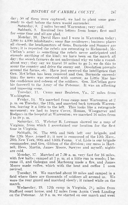 day; 50 of them were captured: we had to plant some guns ready to shell before the town would surrender. Saturday, 8. 2 miles beyond Warrenton; very cold. Sabbath, 9. Received two letters from home; first mail for some time and all are glad. Monday, 10. David Hess and I were in Warrenton today; 3,000 to 4,000 inhabitants; some fine residences; business places all closed; the headquarters of Gens. Burnside and Sumner are here; it is reported the rebels are retreating to Richmond; McClellan's army is something the rebels never anticipated and exceeds anything of the kind; we have been on the march all day; the secesh farmers do not understand why we take a roundabout way; they say we travel 10 miles to go 5; we do this to scour the country and drive the enemy out. Desolation prevails around farms, etc. Have just received the intelligence that Gen. McClellan has been removed and Gen. Burnside succeeds him; the news was received with sorrow, as Little Mac has the confidence and esteem of the soldiers. Gen. McClellan gave his farewell to the Army of the Potomac. It was an affecting and imposing scene. Tuesday, 11. Camp near Bealeton, Va., 57 miles from Washington. Friday, 14. We marched from camp near Warrenton at 2 p. m. on Tuesday, the 11th, and marched back towards Warrenton, leaving it a little to the left. This looks like a retrograde movement; we had to leave Cover, Homan, Wisegarver and Rodgers in the hospital at Warrenton; we marched 16 miles from 2 to 10 p. m. Saturday, 15. Webster B. Lowman showed me a map of Virginia, from which I ascertained our location for the first time in Virginia. Sabbath, 16. The 88th and 94th left our brigade, and the 12th Mass. joined it; it now is composed of the 12th Mass. Joined it; it is now composed of the 12th Mass., 26th New York, 90th and 136th Penna. Col. Lisle is our brigade commander, and Gen. Gibbon of the division; our mess is Hartzell, Hess, Martin, James Moore, Sawyer and myself; nights are cold. Monday, 17. Marched at 7:30 a. m. very fast for 16 miles, with few halts; camped at 3 p. m. at a little run in the woods; I became ill, and Gahegan and Marbourg made a fire, and James Moore made coffee, which with the heat and coffee I soon revived. Tuesday, 18. We marched about 10 miles and camped in a field where there are thousands of soldiers all around us. We were the rear guard and marched slowly; it rained while on the march. Wednesday, 19. 12th camp in Virginia, 2 ½ miles from Stafford court house, and 12 miles from Aquia Creek Landing on the Potomac. At 9 a. m. we started on our march and went |