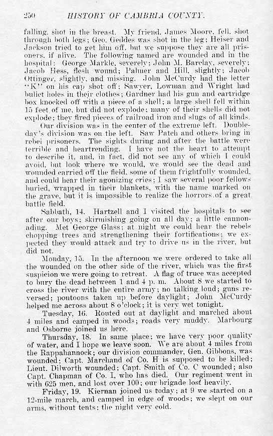 falling, shot in the breast. My friend, James More, fell, shot through both legs; Geo. Geddes was shot in the leg; Heiser and Jackson tried to get him off, but we suppose they are all prisoners, if alive. The following named are wounded and in the hospital: George Markle, severely; John M. Barclay, severely; Jacob Hess, flesh wound; Palmer and Hill, slightly; Jacob Ottinger, slightly and missing. John McCurdy had the letter “K” on his cap shot off; Sawyer, Lowman and Wright had bullet holes in their clothes; Gardner had his gun and cartridge box knocked off with a piece of a shell; a large shell fell within 15 feet of me, but did not explode; many of their shells did not explode; they fired pieces of railroad iron and slugs of all kinds. Our division was in the center of the extreme left. Doubleday's division was on the left. Saw Patch and others bring in rebel prisoners. The sights during and after the battle were terrible and heartrendering. I have not the heart to attempt to describe it, and, in fact, did not see any of which I could avoid, but look where we would, we would see the dead and wounded carried off the field, some of them frightfully wounded, and could hear their agonizing cries; I saw several poor fellows buried, wrapped in their blankets, with the name marked on the grave, but it is impossible to realize the horrors of a great battle field. Sabbath, 14. Hartzell and I visited the hospitals to see after our boys; skirmishing going on all day; a little cannonading. Met George Glass; at night we could hear the rebels chopping trees and strengthening their fortifications; we expected they would attack and try to drive us in the river, but did not. Monday, 15. In the afternoon we were ordered to take all the wounded on the other side of the river, which was the first suspicion we were going to retreat. A flag of truce was accepted to bury the dead between 1 and 4 p. m. About 8 we started to cross the river with the entire army; no talking loud; guns reversed; pontoons taken up before daylight; John McCurdy helped me across about 8 o'clock; it is very wet tonight. Tuesday, 16. Routed out at daylight and marched about 4 miles and camped in woods; roads very muddy. Marbourg and Osborne joined us here. Thursday, 18. In same place; we have very poor quality of water, and I hope we leave soon. We are about 4 miles from the Rappahannock; our division commander, Gen. Gibbons, was wounded; Capt. Marchand of Co. H is supposed to be killed; Lieut. Dilworth wounded; Capt. Smith of Co. C wounded; also Capt. Chapman of Co. I, who has died. Our regiment went in with 625 men, and lost over 100; our brigade lost heavily. Friday, 19. Kiernan joned us today; at 9 we started on a 12-mile march, and camped in the edge of woods; we slept on our arms, without tents; the night was very cold. |