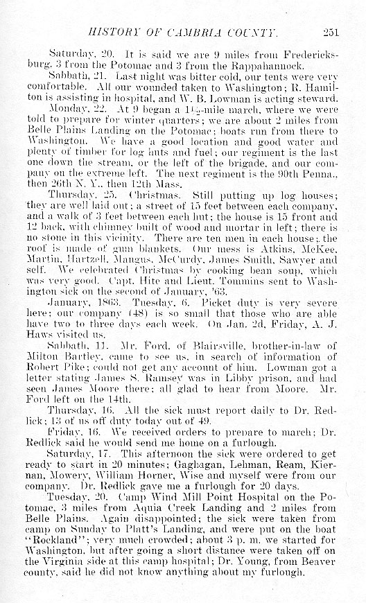 Saturday, 20. It is said we are 9 miles from Fredericksburg, 3 from the Potomac and 3 from Rappahannock. Sabbath, 21. Last night was bitter cold, our tents were very comfortable. All our wounded taken to Washington; R. Hamilton is assisting in hospital, and W. B. Lowman is acting steward. Monday, 22. At 9 began a 1 ˝-mile march, where we were told to prepare for winter quarters; we are about 2 miles from Belle Pains Landing on the Potomac; boats run from there to Washington. We have a good location and good water and plenty of timber for log huts and fuel; our regiment is the last one down the stream, or the left of the brigade, and our company on the extreme left. The next regiment is the 90th Penna., then 26th N.Y., then 12th Mass. Thursday, 25, Christmas. Still putting up log houses; they are well laid out; a street of 15 feet between each company, and a walk of 3 feet between each hut; the house is 15 front and 12 back, with chimney built of wood and mortar in left; there is no stone in this vicinity. There are ten men in each house; the roof is made of gum blankets. Our mess is Atkins, McKee, Martin, Hartzell, Mangus, McCurdy, James Smith, Sawyer and self. We celebrated Christmas by cooking bean soup, which was very good. Capt. Hite and Lieut. Tommins sent to Washington sick on the second of January, '63. January, 1863. Tuesday, 6. Picket duty is very severe here; our company (48) is so small that those who are able have two to three days each week. On Jan. 2d, Friday, A. J. Haws visited us. Sabbath, 11. Mr. Ford, of Blairsville, brother-in-law of Milton Bartley, came to see us, in search of information of Robert Pike; could not get any account of him. Lowman got a letter stating James S. Ramsey was in Libby prison, and had seen James Moore there; all glad to hear from Moore. Mr. Ford left on the 14th. Thursday, 16. All the sick must report daily to Dr. Redlick; 13 of us off duty today out of 49. Friday, 16. We received orders to prepare to march; Dr. Redlick said he would send me home on a furlough. Saturday, 17. This afternoon the sick were ordered to get ready to start in 20 minutes; Gaghagan, Lehman, Ream, Kiernan, Mowery, William Horner, Wise and myself were from our company. Dr. Redlick gave me a furlough for 20 days. Tuesday, 20. Camp Wind Mill Point Hospital on the Potomac, 3 miles from Aquia Creek Landing and 2 miles from Belle Plains. Again disappointed; the sick were taken from camp on Sunday to Platt's Landing, and were put on the boat “Rockland”; very much crowded; about 3 p. m. we started for Washington, but after going a short distance were taken off on the Virginia side at this camp hospital; Dr. Young, from Beaver county, said he did not know anything about my furlough. |