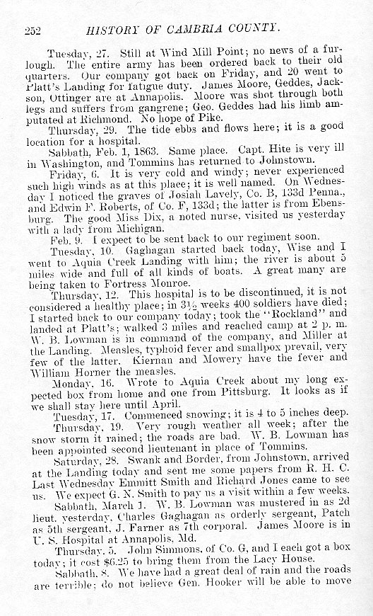 Tuesday, 27. Still at Wind Mill Point; no news of a furlough. The entire army has been ordered back to their old quarters. Our company got back on Friday, and 20 went to Platt's Landing for fatigue duty. James Moors, Geddes, Jackson, Ottinger are at Annapolis. Moore was shot through both legs and suffers from gangrene; Geo. Geddes had his limb amputated at Richmond. No hope of Pike. Thursday, 29. The tide ebbs and flows here; it is a good location for a hospital. Sabbath, Feb. 1, 1863. Same place. Capt. Hite is very ill in Washington, and Tommins has returned to Johnstown. Friday, 6. It is very cold and windy; never experienced such high winds as at this place; it is well named. On Wednesday I noticed the graves of Josiah Lavely, Co. B, 133d Penna., and Edwin F. Roberts, of Co. F, 133d; the latter is from Ebensburg. The good Miss Dix, a noted nurse, visited us yesterday with a lady from Michigan. Feb. 9. I expect to be sent back to our regiment soon. Tuesday, 10. Gaghagan started back today, Wise and I went to Aquia Creek Landing with him; the river is about 5 miles wide and full of all kinds of boats. A great many are being taken to Fortress Monroe. Thursday, 12. This hospital is to be discontinued, it is not considered a healthy place; in 3˝ weeks 400 soldiers have died; I started back to our company today; took the “Rockland” and landed at Platt's; walked 3 miles and reached camp at 2 p. m. W. B. Lowman is in command of the company, and Miller at the Landing. Measles, thyphoid fever and smallpox prevail, very few of the latter. Kiernan and Mowery have the fever and William Horner the measles. Monday, 16. Wrote to Aquia Creek about my long expected box from home and one from Pittsburg. It looks as if we shall stay here until April. Tuesday, 17. Commenced snowing; it is 4 to 5 inches deep. Thursday, 19. Very rough weather all week; after the snow storm it rained; the roads are bad. W. B. Lowman has been appointed second lieutenant in place of Tommins. Saturday, 28. Swank and Border, form Johnstown, arrived at the Landing today and sent me some papers from R. H. C. Last Wednesday Emmitt Smith and Richard Jones came to see us. We expect G. N. Smith to pay us a visit within a few weeks. Sabbath, March 1. W. B. Lowman was mustered in as 2d. lieut. yesterday. Charles Gaghagan as orderly sergeant, Patch as 5th sergeant, J. Farner as 7th corporal. James Moore is in U. S. Hospital at Annapolis, Md. Thursday, 5. John Simmons, of Co. G, and I each got a box today; it cost $6.25 to bring them from the Lacy House. Sabbath, 8. We have had a great deal of rain and the roads are terrible; do not believe Gen. Hooker will be able to move |