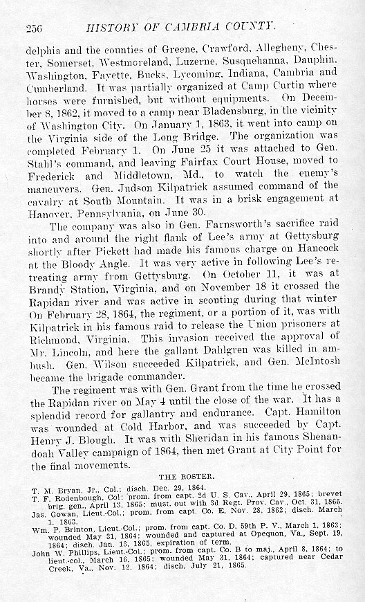 delphia and the counties of Greene, Crawford Allegheny, Chester, Somerset, Westmoreland, Luzerne, Susquehanna, Dauphin, Washington, Fayette, Bucks, Lycoming, Indiana, Cambria and Cumberland. It was partially organized at Camp Curtin where horses were furnished, but without equipments. On December 8, 1862, it moved to a camp near Bladensburg, in the vicinity of Washington City. On January 1, 1863, it went into camp on the Virginia side of the Long Bridge. The organization was completed February 1. On June 25 it was attached to Gen. Stahl's command, and leaving Fairfax Court House, moved to Frederick and Middletown, MD., to watch the enemy's maneuvers. Gen. Judson Kilpatrick assumed command of the cavalry at South Mountain. It was in a brisk engagement at Hanover, Pennsylvania, on June 30. The company was also in Gen. Farnsworth's sacrifice raid into and around the right flank of Lee's army at Gettysburg shortly after Pickett had made his famous charge on Hancock at the Bloody Angle. It was very active in following Lee's retreating army from Gettysburg. On October 11, it was at Brandy Station, Virginia, and on November 18 it crossed the Rapidan river and was active in scouting during that winter On February 28, 1864, the regiment, or a portion of it, was with Kilpatrick in his famous raid to release the Union prisoners at Richmond, Virginia. This invasion received the approval of Mr. Lincoln, and here the gallant Dahlgren was killed in ambush. Gen. Wilson succeeded Kilpatrick, and Gen. McIntosh became the brigade commander. The regiment was with Gen. Grant from the time he crossed the Papidan river on May 4 until the close of the war. It has a splendid record for gallantry and endurance. Capt. Hamilton was wounded at Cold Harbor, and was succeeded by Capt. Henry J. Blough. It was with Sheridan in his famous Shenandoah Valley campaign of 1864 that met Grant at City Point for the final movements. THE ROSTER