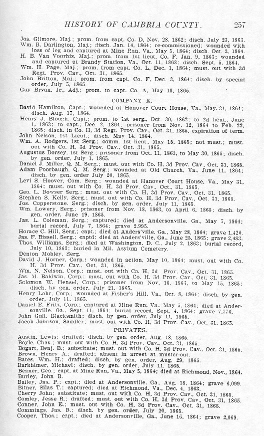 - Henry J. Blough, Capt., prom. to 1st serg., Oct. 30, 1862; to 2d lieut., June 1, 1863; to capt.; Dec. 2, 1864; prisoner from Nov. 12, 1864 to Feb. 22, 1865; disch. in Co. H, 3d Regt, Prov. Cav., October 31, 1865, expiration of term.