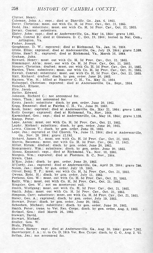 - Shriver, Barney; capt.; died at Andersonville, Ga., Aug,, 30, 1864; grave 7,262.