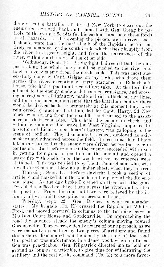 diately sent a battalion of the 2d New York to clear out the enemy on the north bank and connect with Gen. Gregg by patrols, to throw up rifle pits for his carbines and hold these fords at all hazards. In the evening the pickets were driven back. I should state that the north bank of the Rapidan here is entirely commanded by the south bank, which rises abruptly from the river to a great height, and from the narrowness of the river, within short range of the other side. Wednesday, Sept. 16. At daylight I directed that the outposts along the whole line should be pushed to the river and to clear every enemy from the north bank. This was most successfully done by Capt. Griggs on my right, who drove them across the river and to clear every enemy from the north bank. This was most successfully done by the Capt. Griggs on my right, who drove them across the river, excepting a party stationed at Robertson's house, who had a position he could not take. At the ford first alluded to the enemy made a determined resistance, and crossing a regiment of infantry, made a brisk attack on my lines, and for a few moments it seemed that the battalion on duty there would be driven back. Fortunately, at this moment they were reinforced by another battalion, led by Capt. Hasty, 2d New York, who sprang from their saddles and rushed to the assistance of their comrades. This held the enemy in check, and within five minutes, the brave 1st West Virginia, supported by a section of Lieut. Counselman's battery, was galloping to the scene of conflict. They dismounted, formed, deployed as skirmishers and advanced across the field. In less time than I have taken in writing this the enemy were driven across the river in confusion. Just before sunset the enemy succeeded with oxen in getting four guns in position on the summit and opened a heavy fire with shells upon the woods where my reserves were stationed. This was replied by Lieut. Counselman, who, with a well directed shot blew up a limber chest, when they retired. Thursday, Sept. 17. Before daylight I took a section of artillery and masked it in the woods on the party at the Robertson house. As the day broke I opened on them with the guns. Two shells sufficed to drive them across the river, and we had the position. From this time until we were relieved by the infantry all was quiet, excepting an occasional shot. Tuesday, Sept. 22. Gen. Davies, bridgade commander, states: My bridgade (Co. K) crossed the Rapidan at White's Ford, and moved forward in columns to the turnpike between Madison Court House and Gordonsville. On approaching the road the advance struck the enemy's column moving toward Gordonsville. They were evidently aware of our approach, as we were instantly opened on by two pieces of artillery and found skirmishers dismounted and hidden by the side of the road. Our position was unfortunate, in a dense wood, where no formation was practicable. Gen. Kilpatrick directed me to hold my ground as long as practicable, to give time for withdrawing the artillery and the rest of the command (Co. K) to a more favor- |