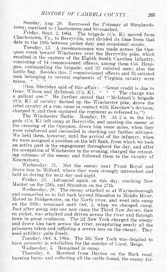 Sunday, Aug. 28. Recrossed the Potomac at Shepherdstown; marched to Charlestown and bivouacked. Friday, Sept. 2, 1864. The brigade (Co. K) moved from Charlestown, Va., to Berryville, and divided its time from that date to the 19th between picket duty and occasional scouts. Tuesday, 13. A reconnoissance was made across the Opequon creek toward Winchester over the Berryville pike, which resulted in the capture of the Eighth South Carolina Infantry, consisting of 14 commissioned officers, among them Col. Henagan, commanding the brigade, and 92 enlisted men; also the battle flag. Besides this, 2 commissioned officers and 35 enlisted men belonging to several regiments of Virginia cavalry were taken. * * * (Gen. Sheridan said of this affair; "Great credit is due to Gens. Wilson and McIntosh (Co. K). * * * The charge was a gallant one." He further stated that "McIntosh's brigade (Co. K) of cavalry dashed up the Winchester pike, drove the rebel cavalry at a run, came in contact with Kershaw's division, charged it, and then captured the regiment as referred to.") The Winchester Battle. Monday 19. At 2 a. m. the brigade (Co. K) left camp at Berryville, and meeting the enemy at the crossing of the Opequon, drove him some miles, when they were reinforced and succeeded in checking our farther advance. We held them, however, until the arrival of the infantry, when we were assigned a position on the left flank, from which we took an active part in the engagement throughout the day, and after the occupation of Winchester in the evening, charged the retreating columns of the enemy and followed them to the vicinity of Kearnstown. Wednesday, 21. Met the enemy near Front Royal and drove him to Milford, where they were strongly intrenched and held us during the next day and night. Friday, 23. Advanced again on this day, reaching New Market on the 25th, and Staunton on the 27th. Wednesday, 28. The enemy attacked us at Waynesborough and compelled us to fall back beyond Staunton to Middle River. Moved to Bridgewater, on the North river, and went into camp on the 30th; remained until Oct. 2, when we changed camp. Just after going into our new camp the Third New Jersey, then on picket, was attacked and driven across the river and through town in great confusion. The 2d New York charged the enemy and drove him back across the river, recapturing nearly all the prisoners taken and inflicting a severe loss on the enemy. They used artillery quite freely. Tuesday, Oct. 4, 1864. The 5th New York was detailed to burn property in retaliation for the murder of Lieut. Meigs. Wednesday, 5. Remained in camp. Thursday, 6. Marched from Dayton on the Back road, burning barns and collecting all the cattle found, the enemy fol- |