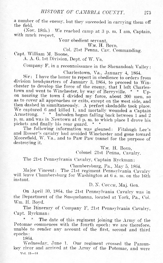 Capt. William M. Boone,WM. H. BOYD, Col. 21st Penna. Cav. Commanding. A. A. G. 1st Division, Dept. of W. Va. Company F, in a reconnaissance in the Shenandoah Valley : Charlestown, Va., January 4, 1864.