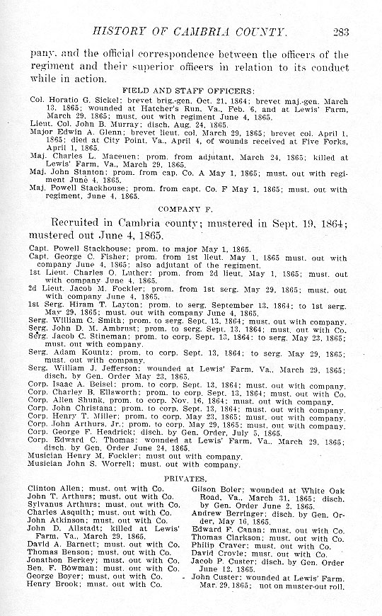- John Custer ; wounded at Lewis' Farm. Mar. 29, 1865 ; not on muster-out roll.