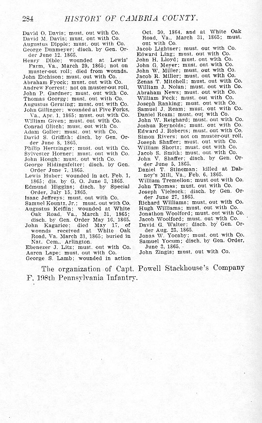 - John Kagarice ; died May 17, of wounds received at White Oak Road, Va., March 31, 1865 ; buried in Nat. Cem., Arlington.
