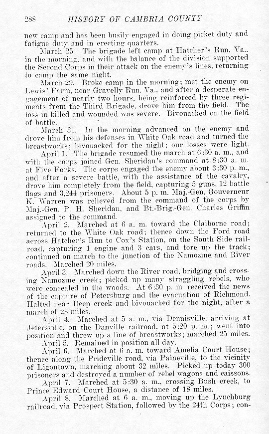 new camp and has been busily engaged in doing picket duty and fatigue duty and in erecting quarters. March 25. The brigade left camp at Hatcher's Run, Va., in the morning, and with the balance of the division supported the Second Corps in their attack on the enemy's lines, returning to camp the same night. March 29. Broke camp in the morning; met the enemy on Lewis' Farm, near Gravelly Run, Va., and after a desperate engagement of nearly two hours, being reinforced by three regiments from the Third Brigade, drove him from the field. The loss in killed and wounded was severe. Bivouacked on the field of battle. March 31. In the morning, advanced on the enemy and drove him from his defenses in White Oak road and turned the breastworks; bivouacked for the night; our losses were light. April 1. The brigade resumed the march at 6:30 a. m. and with the corps joined Gen. Sheridan's command at 8:30 a. m. at Five Forks. The corps engaged the enemy about 3:30 p. m., and after a severe battle, with the assistance of the cavalry, drove him completely from the field, capturing 5 guns, 12 battle flags and 3,244 prisoners. About 5 p. m. Maj.-Gen. Gouverneur K. Warren was relieved from the command of the corps by Maj.-Gen. P. H. Sheridan, and Bt.-Brig.-Gen. Charles Griffin assigned to the command. Apr. 2. Marched at 6 a. m. toward the Claiborne road; returned to the White Oak road; thence down the Ford road across Hatcher's Run to Cox's Station, on the South Side railroad, capturing 1 engine and 3 cars, and tore up the track; continued on march to the junction of the Namozine and River roads. Marched 20 miles. April 3. Marched down the River Road, bridging and crossing Namozine creek; picked up many straggling rebels, who were concealed in the woods. At 6:30 p. m. received the news of the capture of Petersburg and the evacuation of Richmond. Halted near Deep creek and bivouacked for the night, after a march of 23 miles. April 4. Marched at 5 a .m. via Dennisville, arriving at Jetersville, on the Danville railroad, at 5:20 p. m.; went into position and threw up a line of breastworks; marched 25 miles. April 5. Remained in position all day. April 6. Marched at 6 a. m. toward Amelia Court House; thence along the Prideville road, via Paineville, to the vicinity of Ligontown, marching about 32 miles. Picked up today 300 prisoners and destroyed a number of rebel wagons and caissons. April 7. Marched at 5:30 a. m., crossing Bush creek, to Prince Edward Court House, a distance of 18 miles. April 8. Marched at 6 a. m. moving up the Lynchburg railroad, via Prospect Station, followed by the 24th Corps; con- |
