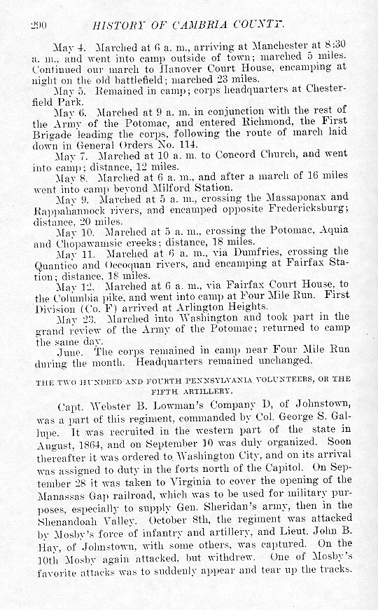 OR THE FIFTH ARTILLERY. Capt. Webster B. Lowman's Company D, of Johnstown, was a part of this regiment, commanded by Col. George S. Gallupe. It was recruited in the western part of the state in August, 1864, and on September 10 was duly organized. Soon thereafter it was ordered to Washington City, and on its arrival was assigned to duty in the forts north of the Capitol. On September 18 it was taken to Virginia to cover the opening of the Manassas Gap railroad, which was to be used for military purposes, especially to supply Gen. Sheridan's army, then in the Shenandoah Valley. October 8th, the regiment was attacked by Mosby's force of infantry and artillery, and Lieut. John B. Hay, of Johnstown, with some others, was captured. On the 10th Mosby again attacked, but withdrew. One of Mosby's favorite attacks was to suddenly appear and tear up the tracks. |