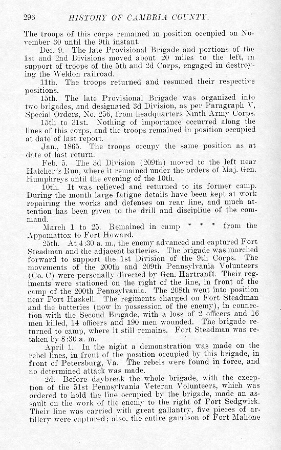The troops of this corps remained in position occupied on November 30 until the 9th instant. Dec. 9. The late Provisional Brigade and portions of the 1st and 2nd Divisions moved about 20 miles to the left, in support of troops of the 5th and 2d Corps, engaged in destroying the Weldon railroad. 11th. The troops returned and resumed their respective positions. 15th. The late Provisional Brigade was organized into two brigades, and designated 3d Division, as per Paragraph V, Special Orders, No. 256, from headquarters Ninth Army Corps. 15th to 31st. Nothing of importance occurred along the lines of this corps, and the troops remained in position occupied at date of last report. Jan., 1865. The troops occupy the same position as at date of last return. Feb. 5. The 3d Division (209th) moved to the left near Hatcher's Run, where it remained under the orders of Maj. Gen. Humphreys until the evening of the 10th. 10th. It was relieved and returned to its former camp. During the month large fatigue details have been kept at work repairing the works and defenses on rear line, and much attention has been given to the drill and discipline of the command. Mar. 1 to 25. Remained in camp * * * from the Appomattox to Fort Howard. 25th. At 4:30 a.m,. the enemy advanced and captured Fort Steadman and the adjacent batteries. The brigade was marched forward to support the 1st Division of the 9th Corps. The movements of the 200th and 209th Pennsylvania Volunteers (Co. C) were personally directed by Gen. Hartranft. Their regiments were stationed on the right of the line, in front of the camp of the 200th Pennsylvania. The 208th went into position near Fort Haskell. The regiments charged on Fort Steadman and the batteries (now in possession; of the enemy), in connection with the Second Brigade, with a loss of 2 officers and 16 men killed, 14 officers and 190 men wounded. The brigade returned to camp, where it still remains. Fort Steadman was retaken by 8:30 a. m. April 1. In the night a demonstration was made on the rebel lines, in front of the position occupied by this brigade, in front of Petersburg, Va. The rebels were found in force, and no determined attack was made. 2d. Before daybreak the whold brigade, with the exception of the 51st Pennsylvania Veteran Volunteers, which was ordered to hold the line occupied by the brigade, made an assault on the work of the enemy to the right of Fort Sedgwick. Their line was carried with great gallantry five pieces of artillery were captured; also, the entire garrison of Fort Mahone |
