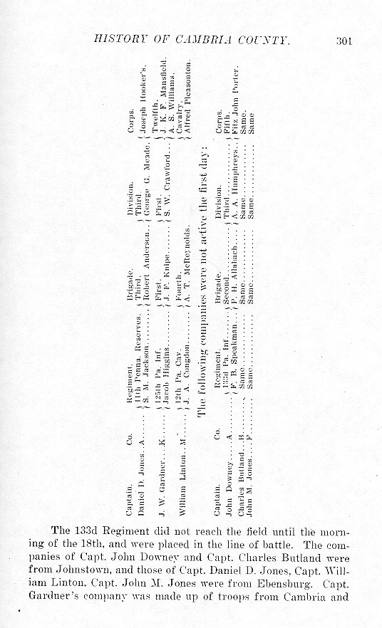 The 133d Regiment did not reach the field until the morning of the 18th, and were placed in the line of battle. The companies of Capt. John Downey and Capt. Charles Butland were from Johnstown, and those of Capt. Daniel D. Jones, Capt.William Linton, Capt. John M. Jones were from Ebensburg. Capt. Gardner's company was made up of troops from Cambria and