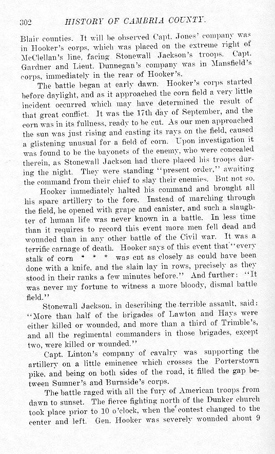 Blair counties. It will be observed Capt. Jones' company was in Hooker's corps, which was placed on the extreme right of McClellan's line, facing Stonewall Jackson's troops. Capt.Gardner and Lieut. Dunnegan's company was in Mansfield's corps, immediately in the rear of Hooker's. The battle began at early dawn. Hooker's corps started before daylight, and as it approached the corn field a very little incident occurred which may have determined the result of that great conflict. It was the 17th day of September, and the corn was in its fullness, ready to be cut. As our men approached the sun was just rising and casting its rays on the field, caused a glistening unusual for a field of corn. Upon investigation it was found to be the bayonets of the enemy, who were concealed therein, as Stonewall Jackson had there placed his troops during the night. They were standing "present order", awaiting the command from their chief to slay their enemies. But not so. Hooker immediately halted his command and brought all his spare artillery to the fore. Instead of marching through the field, he opened with grape and canister, and such a slaughter of human life was never known in a battle. In less time than it requires to record this event more men fell dead and wounded than in any other battle of the Civil war. It was a terrific carnage of death. Hooker says of this event that "every stalk of corn * * * was cut as closely as could have been done with a knife, and the slain lay in rows, precisely as they stood in their ranks a few minutes before." And further: "It was never my fortune to witness a more bloody, dismal battle field." Stonewall Jackson, in describing the terrible assault, said: "More than half of the brigades of Lawton and Hays were either killed or wounded, and more than a third of Trimble's, and all the regimental commanders in those brigades, except two, were killed or wounded." Capt. Linton's company of cavalry was supporting the artillery on a little eminence which crosses the Porterstown pike, and being on both sides of the road, it filled the gap between Sumner's and Burnside's corps. The battle raged with all the fury of American troops from dawn to sunset. The fierce fighting north of the Dunker church took place prior to 10 o'clock, when the contest changed to the center and left. Gen. Hooker was severely wounded about 9 |