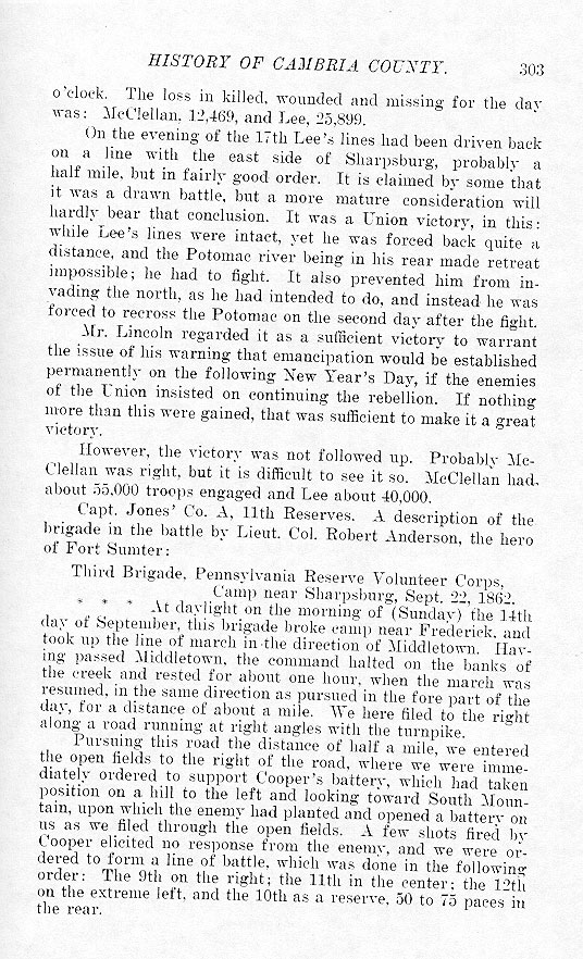 o'clock. The loss in killed, wounded and missing for the day was: McClellan, 12,469, and Lee, 25,899. On the evening of the 17th Lee's lines had been driven back on a line with the east side of Sharpsburg, probably a Half mile, but in fairly good order. It is claimed by some that it was a drawn battle, but a more mature consideration will hardly bear that conclusion. It was a Union victory, in this: while Lee's lines were intact, yet he was forced back quite a distance, and the Potomac river being in his rear made retreat impossible; he had to fight. It also prevented him from invading the north, as he had intented to do, and instead he was forced to recross the Potomac on the second day after the fight. Mr. Lincoln regarded it as a sufficient victory to warrent the issue of his warning that emaucipation would be established permanently on the following New Year's Day, if the enemies of the Union insisted on continuing the rebellion. If nothing more than this were gained, that was sufficient to make it a great victory. However, the victory was not followed up. Probably McClellan was right, but it is difficult to see it so. McClellan had about 55,000 troops engaged and Lee about 40,000. Capt. Jones' Co. A. 11th Reserves. A description of the brigade in the battle by Lieut. Col. Robert Anderson, the hero of Fort Sumter; Third Brigade, Pennsylvania Reserve Volunteer Corps, Camp near Sharpsburg, Sept. 22, 1862.