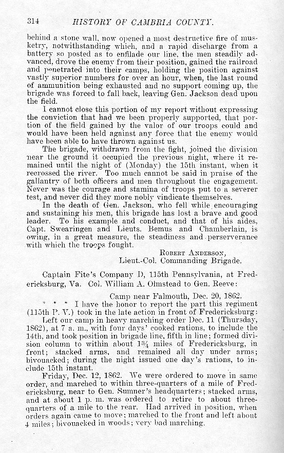 behind a stone wall, now opened a most destructive fire of musketry, notwithstanding which, and a rapid discharge from a battery so posted as to enfilade our line, the men steadily advanced, drove the enemy from their position, gained the railroad and penetrated into their camps, holding the position against vastly superior numbers for over an hour, when, the last round of ammunition being exhausted and no support coming up, the brigade was forced to fall back, leaving Gen. Jackson dead upon the field. I cannot close this portion of my report without expressing the conviction that had we been properly supported, that portion of the field gained by the valor of our troops could and would have been held against any force that the enemy would have been able to have thrown against us. The brigade, withdrawn from the fight, joined the division near the ground it occupied the previous night, where it remained until the night of (Monday) the 15th instant, when it recrossed the river. Too much cannot be said in praise of the gallantry of both officers and men throughout the engagement. Never was the courage and stamina of troops put to a severer test, and never did they more nobly vindicate themselves. In the death of Gen. Jackson, who fell while encouraging and sustaining his men, this brigade has lost a brave and good leader. To his example and conduct, and that of his aides, Capt. Swearingen and Lieuts. Bemus and Chamberlain, is owing, in a great measure, the steadiness and perserverance with which the troops fought. Robert Anderson,