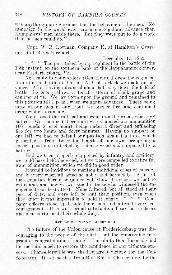 was anything more glorious than the behavior of the men. No campaign in the world ever saw a more gallant advance than Humphrey's men made there. But they were put to do a work than no men could do.” Capt. W. B. Lowman, Company K, at Hamilton's Crossing. Col. Bayne's report: December 17, 1862.