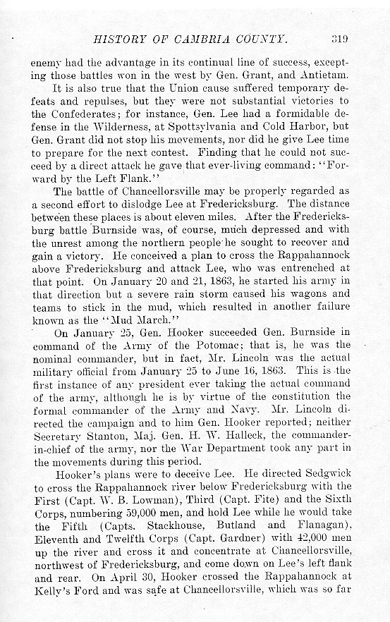 enemy had the advantage in its continual line of success, excepting those battles won in the west by Gen. Grant, and Antietam. It is also true that the Union cause suffered temporary defeats and repulses, but they were not substantial victories to the Confederates; for instance, Gen. Lee had a formidable defense in the Wilderness, at Spottsylvania and Cold Harbor, but Gen. Grant did not stop his movements, nor did he give Lee time to prepare for the next contest. Finding that he could not succeed by a direct attack he gave that ever-living command: “Forward by the Left Flank.” The battle of Chancellorsville may be properly regarded as a second effort to dislodge Lee at Fredericksburg. The distance between these places is about eleven miles. After the Fredericksburg battle Burnside was, of course, much depressed and with the unrest among the northern people he sought to recover and gain a victory. He conceived a plan to cross the Rappahannock above Fredericksburg and attack Lee, who was entrenched at that point. On January 20 and 21, 1863, he started his army in that direction but a severe rain storm caused his wagons and teams to stick in the mud, which resulted in another failure known as the “Mud March.” On January 25, Gen. Hooker succeeded Gen. Burnside in command of the Army of the Potomac; that is, he was the nominal commander, but in fact, Mr. Lincoln was the actual military official from January 25 to June 16, 1863. This is the first instance of any president ever taking the actual command of the army, although he is by virtue of the constitution the formal commander of the Army and Navy. Mr. Lincoln directed the campaign and to him Gen. Hooker reported; neither Secretary Stanton, Maj. Gen. H. W. Halleck, the commander-in-chief of the army, nor the War Department took any part in the movements during this period. Hooker's plans were to deceive Lee. He directed Sedgwick to cross the Rappahannock river below Fredericksburg with the First (Capt. W. B. Lowman), Third (Capt. Fite) and the Sixth Corps, number 59,000 men, and hold Lee while he would take the Fifth. (Capts. Stackhouse, Butland and Flanagan), Eleventh and Twelfth Corps (Capt. Gardner) with 42,000 men up the river and cross it and concentrate at Chancellorsville, northwest of Fredericksburg, and come down on Lee's left flank and rear. On April 30, Hooker crossed the Rappahannock at Kelly's Ford and was safe at Chancellorsville, which was so far |