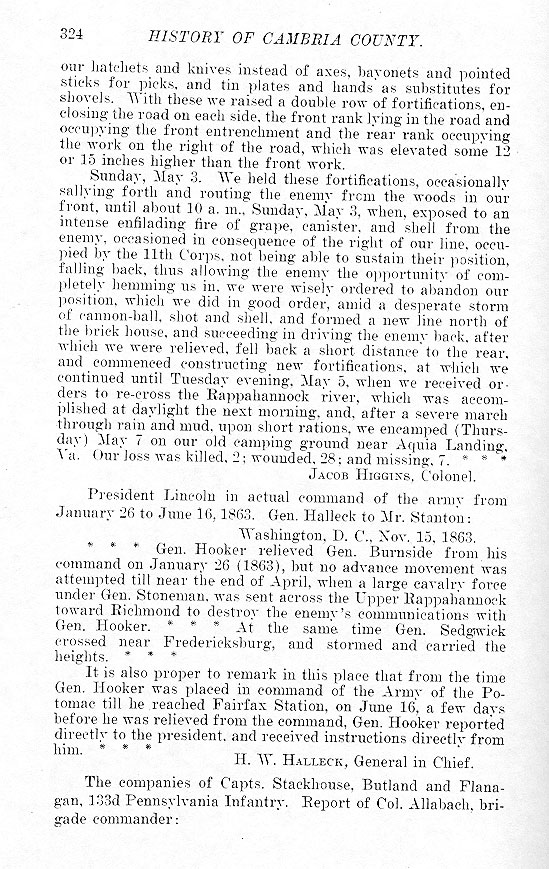 our hatchets, and knives instead of axes, bayonets and pointed sticks for picks, and tin plates and hands as substitutes for shovels. With these we raised a double row of fortifications, enclosing the road on each side, the front rank lying in the road and occupying the front entrenchment and the rear rank occupying the work on the right of the road, which was elevated some 12 to 15 inches higher than the front work. Sunday, May 3. We held these fortifications, occasionally sallying forth and routing the enemy from the woods in our front, until about 10 a. m., Sunday, May 3, when, exposed to an intense enfilading fire of grape, canister, and shell from the enemy, occasioned in consequence of the right of our line, occupied by the 11th Corps, not being able to sustain their position, falling back, thus allowing the enemy the opportunity of completely hemming us in, we were wisely ordered to abandon our position, which we did in good order, amid a desperate storm of cannon-ball, shot and shell, and formed a new line north of the brick house, and succeeding in driving the enemy back, after which we were relieved, fell back a short distance to the rear, and commenced constructing new fortifications, at which we continued until Tuesday evening, May 5, when we received orders to re-cross the Rappahannock river, which was accomplished at daylight the next morning, and after a severe march through rain and mud, upon short rations, we encamped (Thursday) May 7 on our old camping ground near Aquia Landing, Va., Our loss was killed, 2; wounded, 28; and missing, 7. * * * Jacob Higgins, Colonel.