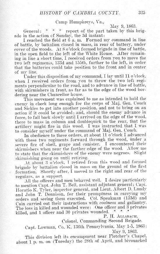 General: * * * report of the part taken by this brigade in the action of Sunday, the 3d instant:May 9, 1863. I reached the field at 6 a. m. Formed my command in line of battle, by battalion closed in mass, in rear of battery, under cover of the woods. At 8 o'clock formed brigade in line of battle, in open field to the left of the White House. After remaining in line a short time, I received orders from you to move the two left regiments, 133d and 135th, farther to the left, in order that the batteries could take position to the front and in center of my line. Under this disposition of my command, I lay until 11 o'clock, when I received orders from you to throw the two left regiments perpendicular to the road, and to advance in line of battle, with skirmishers in front, as far as to the edge of the wood bordering near the Chancellor house. This movement was explained to me as intended to hold the enemy in check long enough for the corps of Maj. Gen. Couch and Sickles to get into another position, and not to bring on an action if it could be avoided; and, should the enemy advance in force, to fall back slowly until I arrived on the edge of the wood, there to mass in column and double quick to the rear, that the artillery might fire in this wood. I was instructed that I was to consider myself under the command of Maj. Gen. Couch. In obedience to these orders, at about 11 o'clock I advanced with these two regiments forward through the wood, under a sever fire of shell, grape and canister. I encountered their skirmishers when near the farther edge of the wood. Allow me to state that the skirmishers of the enemy were Negroes. Slight skirmishing going on until retiring. At about 3 o'clock, I retired from this wood and formed brigade by battalion closed in mass on the ground of the first formation. Shortly after, I moved to the right and rear of the regulars, as a support. All the officers and men behaved well. I desire particularly to mention Capt. John T. Bell, assistant adjutant general; Capt. Horatio K. Tyler, inspector general, and Lieut. Albert D. Luncy and John T. Dennison, for their promptness in carrying my orders and seeing them executed. Col. Speakman (133d) and Cain carried out their instructions with coolness and gallantry. The loss in killed and wounded were: One officer and 3 privates killed, and 1 officer and 30 privates wounded. * * * P. H. Allabach,