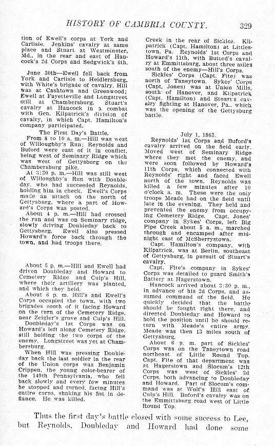 Reynolds' 1st Corps and Buford's cavalry arrived on the field early. Moved west of Seminar Ridge where they met the enemy, and were soon followed by Howard's 11th Corps, which connected with Reynolds' right and faced Ewell north of the town. Reynolds was killed a few minutes after 10 o'clock a. m. These were the only troops Meade had on the field until late in the evening. They held and prevented the enemy from occupying Cemetery Ridge. Capt. Jones' company in Sykes' Corps, left big Pipe Creek about 5 a. m., marched through and encamped after midnight east of McSherrystown.