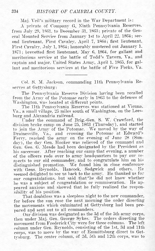 Maj. Veil's military record in the War Department is: A private of Company G. Ninth Pennsylvania Reserves, from July 29, 1861, to December 31, 1863: private of the General Mounted Service from January 1st to April 22, 1864; second lieutenant, First Cavalry, April 7, 1864; first lieutenant, First Cavalry, July 1, 1864; honorably mustered out January 1, 1871; brevetted first lieutenant, May 6, 1864, for gallant and meritorious service at the battle of Todd's Tavern, Va., and captain and major, United States Army, April 1, 1865, for gallant and meritorious services at the battle of Five Forks, Va. Col. S. M. Jackson, commanding 11th Pennsylvania Reserves at Gettysburg: The Pennsylvania Reserve Division having been recalled from the Army of the Potomac early in 1863 to the defenses of Washington, was located at different points. The 11th Pennsylvania Reserves was stationed at Vienna, Va., a small village, 25 miles south of Washington, on the Leesburg and Alexandria railroad. Under the command of Brig.-Gen. S. W. Crawford, the division broke camp on June 25, 1863 (Thursday), and started to join the Army of the Potomac. We moved by the way of Drainesville, Va., and crossing the Potomac at Edward's Ferry, reached the army on the evening of June 28 (Sunday), the day Gen. Hooker was relieved of the command and Gen. Geo. G. Meade had been designated by the President as his successor. After reaching our camp that evening, a number of the officers rode over to army headquarters to pay our respects to our old commander, and to congratulate him on his distinguished promotion. We found him in close conference with Gens. Reynolds, Hancock, Sedgwick and others. He seemed delighted to see us back to the army. He thanked us for our congratulations, but said that he did not know whether he was a subject of congratulation or commiseration. He appeared anxious and showed that he fully realized the responsibility of his position. That doubtless was a sleepless night to the new commander, for before the sun rose the next morning the order directing the movements which culminated at Gettysburg had been prepared and sent out to all commanders. Our division was designated as the 3d of the 5th army corps, then under Maj. Gen. George Sykes. The orders directing the movement from Frederick City were for three columns. The left column under Gen. Reynolds, consisting of the 1st, 3d and 11th corps, was to move by the way of Emmittsburg direct to Gettysburg. The center column, of 2d, 5th and 12th corps, was to |