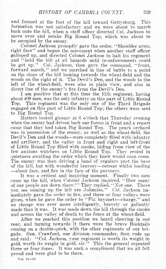 and formed at the foot of the hill toward Gettysburg. This formation was not satisfactory and we were about to march back onto the hill, when a staff officer directed Col. Jackson to move over and retake Big Round Top, which was about to be occupied by the enemy. Colonel Jackson promptly gave the order. “Shoulder arms, and right face” and began the movement when another staff officer galloped up, and directed Colonel Jackson to halt his regiment and “hold the hill at all hazards until re-enforcements could be got up.” Col. Jackson, then gave the command, “front, forward march,” and we marched in line of battle to a point on the slope of the hill looking toward the wheat-field and the and the woods on the right of it. The Devil's Den, and the woods to the left of the wheat-field, were also in plain view, and also in direct line of the enemy's fire from the Devil's Den. I am positive that at this time the 11th regiment, having about 400 men, was the only infantry on this part of Little Round Top. This regiment was the only one of the Third Brigade engaged on this part of Little Round Top; the others were sent to Big Round Top. Matters looked gloomy at 6 o'clock that Thursday evening, when the enemy had driven back our forces in front and a report came that they had taken Big Round Top. The peach orchard was in possession of the enemy, as well as the wheat-field, the Devil's Den and the woods---were completely filled with infantry and artillery, and the valley in front and right and left-front of Little Round Top filled with smoke, hiding from view of the few anxious watchers on Little Round Top. They rested in quietness awaiting the order which they knew would soon come. The enemy was then driving a band of regulars past the base of the hill, but with wonderful bravery---retreat whilst loading---about face, and fire in the face of the pursuers. It was a critical and inspiring moment. Finally two men came up the hill, when Colonel Jackson inquired, ”How many of our people are down there?" They replied, "Not one. Those you see coming up the hill are Johnnies.” Col. Jackson immediately gave the order to fire., and three or four volleys were given, when he gave the order to “Fix bayonets---charge,” and no charge was ever more intelligently, bravely or gallantly made than it was. It was made down the hill through the smoke and across the valley of death to the fence at the wheat-field. After we reached this position we heard cheering in our rear, and turning towards it there were the brave Bucktails coming on a double-quick, with the other regiments of our brigade. Gen. Crawford, our division commander, then rode up and said: “Col. Jackson your regiment is worth its weight in gold, worth its weight in gold, sir.” This the general repeated three or four times. It was such a compliment that we all felt proud and were glad to be there. |