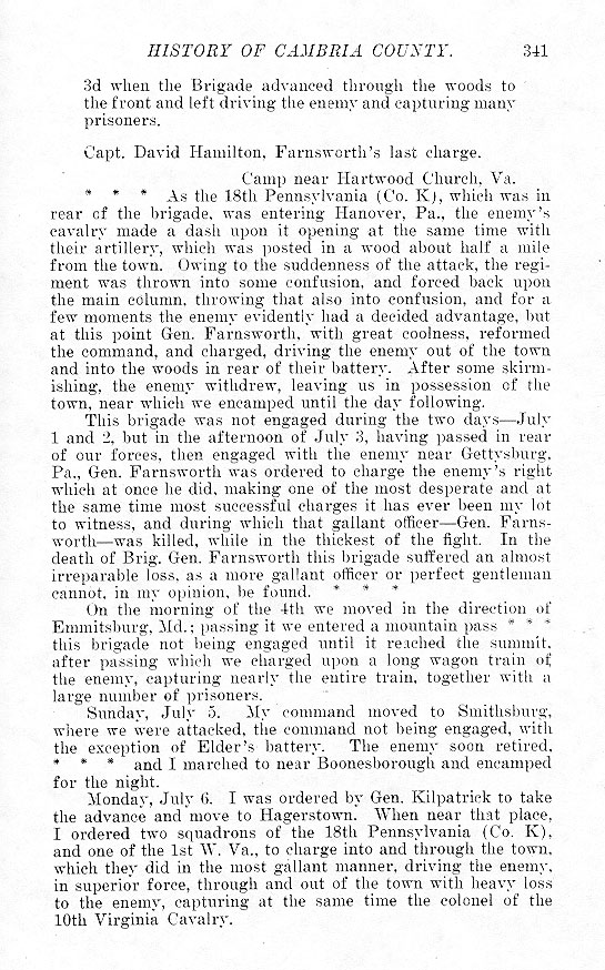 * * * As the 18th Pennsylvania (Co. K), which was in rear of the brigade, was entering Hanover, Pa., the enemy's cavalry made a dash upon it opening at the same time with their artillery, which was posted in a wood about half a mile from the town. Owing to the suddenness of the attack, the regiment was thrown into some confusion, and forced back upon upon the main column, throwing that also into confusion, and for a few moments the enemy evidently had a decided advantage, but at this point Gen. Farnsworth, with great coolness, reformed the command, and charged, driving the enemy out of the town and into the woods in rear of their battery. After some skirmishing, the enemy withdrew, leaving us in possession of the town, near which we encamped until the day following.This brigade was not engaged during the two days---July 1 and 2, but in the afternoon of July 3, having passed in rear of our forces, the engaged with the enemy near Gettysburg, Pa., Gen. Farnsworth was ordered to charge the enemy's right which at once he did, making one of the most desperate and at the same time most successful charges it has ever been my lot to witness, and during which that gallant officer--- Gen. Farnsworth---was killed, while in the thickest of the fight. In the death of Brig. Gen. Farnsworth this brigade suffered an almost irreparable loss, as a more gallant officer or perfect gentleman cannot, in my opinion, be found. On the morning of the 4th we moved in the direction of Emmitsburg, Md.; passing it we entered a mountain pass * * * this brigade not being engaged until it reached the summit , after passing which we charged upon a long wagon train of the enemy, capturing nearly the entire train, together with a large number of prisoners. Sunday, July 5th. My command moved to Smithsburg, where we were attacked, the command not being engaged, with the exception of Elders's battery. The enemy soon retired.. * * * and I marched to near Boonesborough and encamped for the night. Monday, July 6. I was ordered by Gen. Kilpatrick to take the advance and move to Hagerstown. When near that place, I ordered two squadrons of the 18th Pennsylvania (Co. K), and one of the 1st W, Va. to charge into and through the town, which they did in the most gallant manner, driving the enemy in superior force, through and out of the town with heavy loss to the enemy, capturing at the same time the colonel of the 10th Virginia Cavalry. |