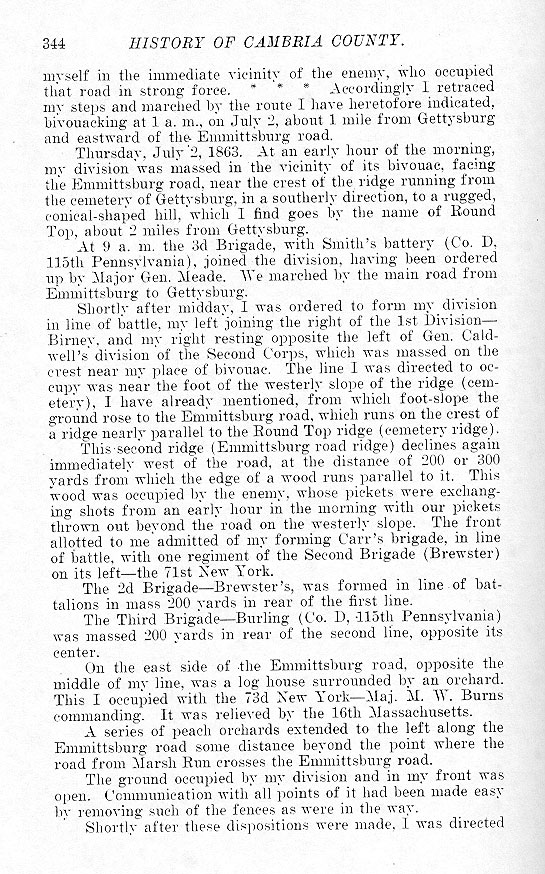 myself in the immediate vicinity of the enemy, who occupied that road in strong force. * * * Accordingly I retraced my steps and marched by the route I have heretofore indicated, bivouacking at 1 a.m., on July 2, about 1 mile from Gettysburg and eastward of the Emmittsburg road. Thursday, July 2, 1863. At an early hour of the morning, my division was massed in the vicinity of its bivouac, facing the Emmittsburg road, near the crest of the ridge running from the cemetery of Gettysburg, in a southerly direction, to a rugged, conical-shaped hill, which I find goes by the name of Round Top, about 2 miles from Gettysburg. At 9 a.m. the 3d Brigade, with Smith's battery (Co. D, 115th Pennsylvainia), joined the division, having been ordered up by Major Gen. Meade. We marched by the main road from Emmittsburg to Gettysburg. Shortly after midday, I was ordered to form my division in line of battle, my left joing the right of the 1st Division—Birney, and my right resting opposite the left of Gen. Caldwell's division of the Second Corps, which was massed on the crest near my place of bivonac. The line I was directed to occupy was near the foot of the westerly slope of the ridge (cemetery), I have already mentioned, from which foot-slope the ground rose to the Emmittsburg road, which runs on the crest of a ridge nearly parallel to the Round Top ridge (cemetery ridge). This second ridge (Emmittsburg road ridge) declines again immediately west of the road, at the distance of 200 or 300 yards from which the edge of a wood runs parallel to it. This wood was occupied by the enemy, whose pickets were exchanging shops from an early hour in the morning with our pickets thrown out beyond the road on the westerly slope. The front allotted to me admitted of my forming Carr's brigade, in line of battle, with one regiment of the Second Brigade (Brewster) on its left—the 71st New York. The 2d Brigade—Brewster's, was formed in line of battalions in mass 200 yards in rear of the second line, opposite its center. On the east side of the Emmittsburg road, opposite the middle of my line, was log house surrounded by an orchard. This I occupied with the 73d New York—Maj. M. W. Burns commanding. It was relieved by the 16th Massachusetts. A series of peach orchards extended to the left along the Emmittsburg road some distance beyond the point where the road from Marsh Run crosses the Emmittsburg road. The ground occupied by my division and in my front was open. Communication with all points of it had been made easy by removing such of the fences as were in the way. Shortly after these dispostions were made, I was directed |