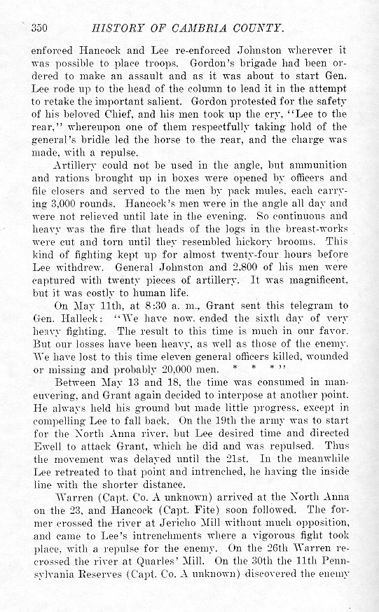 enforced Hancock and Lee re-enforced Johnston wherever it was possible to place troops. Gordon's brigade had been ordered to make an assault and as it was about to start Gen. Lee rode up to the head of the column to lead it in the attempt to retake the important salient. Gordon protested for the safety of his beloved Chief, and his men took up the cry, “Lee to the rear,” whereupon one of them respectfully taking hold of the general's bridle led the horse to the rear, and the charge was made, with a repulse. Artillery could not be used in the angle, but ammunition and rations brought up in boxes were opened by officers and file closers and served to the men by pack mules, each carrying 3,000 rounds. Hancock's men were in the angle all day and were not relieved until late in the evening. So continuous and heavy was the fire that heads of the logs in the breast-works were cut and torn until they resembled hickory brooms. This kind of fighting kept up for almost twenty-four hours before Lee withdrew. General Johnston and 2,800 of his men were captured with twenty pieces of artillery. It was magnificent, but it was costly to human life. On May 11th, at 8:30 a. m., Grant sent this telegram to Gen. Halleck: “We have now. ended the sixth day of very heavy fighting. The result to this time is much in our favor. But our losses have been heavy, as well as those of the enemy. We have lost to this time eleven general officers killed, wounded or missing and probably 20,000 men. * * * “ Between May 13 and 18, the time was consumed in maneuvering, and Grant again decided to interpose at another point. He always held his ground but made little progress, except in compelling Lee to fall back. On the 19th the army was to start for the North Anna river, but Lee desired time and directed Ewell to attack Grant, which he did and was repulsed. Thus the movement was delayed until the 21st. In the meanwhile Lee retreated to that point and intrenched, he having the inside line with the shorter distance. Warren (Capt. Co. A unknown) arrived at the North Anna on the 23, and Hancock (Capt. Fite) soon followed. The former crossed the river at Jericho Mill without much opposition, and came to Lee's intrenchments where a vigorous fight took place, with a repulse for the enemy. On the 26th Warren re-crossed the river at Quarles' Mill. On the 30th the 11th Pennsylvania Reserves (Capt. Co. A unknown) discovered the enemy |