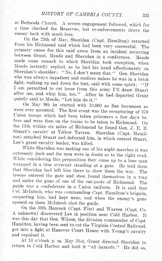 at Bethesda Church. A severe engagement followed, which for a time checked the Reserves, but re-enforcements drove the enemy back with much loss. On the 25th of May, Sheridan (Capt. Hamilton) returned from his Richmond raid which had been very successful. The primary cause for this raid arose from an incident occurring between Grant, Meade and Sheridan in a conference. Meade made some remark to which Sheridan took exception, when Meade instantly replied, as he laid his hand affectionately on Sheridan's shoulder: “No, I don't mean that.” Gen. Sheridan who was always impatient and restless unless he was in a brisk fight, walking up and down the tent, said with some spirit: “If I am permitted to cut loose from this army I'll draw Stuart after me, and whip him, too.” After he had departed Grant quietly said to Meade, “Let him do it.” On May 9th he started with 10,000 as fine horsemen as were ever mounted. The first event was the recapturing of 378 Union troops which had been taken prisoners a few days before and were then on the trains to be taken to Richmond. On the 11th within six miles of Richmond he found Gen. J. E. B. Stuart's cavalry at Yellow Tavern. Sheridan (Capt. Hamilton) attacked Stuart and defeated him, in which contest Stuart, Lee's great cavalry leader, was killed. While Sheridan was making one of his night marches it was extremely dark and the men were in doubt as to the right road. While considering this proposition they came up to a lone man wrapped in a blue overcoat standing at a gate. He told them that Sheridan had left him there to show them the way. The troops entered the gate and soon found themselves in a trap and under the guns of one of the out-posts of Richmond. The guide was a confederate in a Union uniform. It is said that Col. McIntosh, who was commanding Capt. Hamilton's brigade, suspecting him, had kept near, and when the enemy's guns opened on them McIntosh shot the guide. On the 30th Hancock (Capt Fite) and Warren (Capt. Co. A unknown) discovered Lee in position near Cold Harbor. It was this day that Gen. Wilson, the division commander of Capt. Hamilton, having been sent to cut the Virginia Central Railroad, got into a fight at Hanover Court House with Young's cavalry and repulsed it. At 10 o'clock p. m. May 31st, Grant directed Sheridan to return to Cold Harbor and hold it “all hazards.” He did so, |