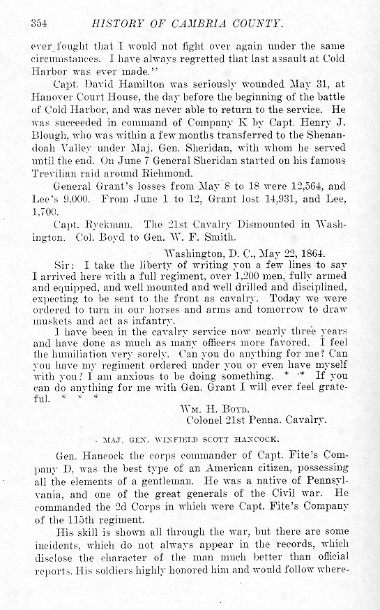 ever fought that I would not fight over again under the same circumstances. I have always regretted that last assault at Cold Harbor was ever made.” Capt. David Hamilton was seriously wounded May 31, at Hanover Court House, the day before the beginning of the battle of Cold Harbor, and was never able to return to the service. He was succeeded in command of Company K by Capt. Henry J. Blough, who was within a few months transferred to the Shenandoah Valley under Maj. Gen. Sheridan, with whom he served until the end. On June 7 General Sheridan started on his famous Trevilian raid around Richmond. General Grant's losses from May 8 to 18 were 12,564, and Lee's 9,000. From June 1 to 12, Grant lost 14,931, and Lee, 1,700. Capt. Ryckman. The 21st Cavalry Dismounted in Washington. Col. Boyd to Gen. W. F. Smith. Washington, D. C., May 22, 1864.