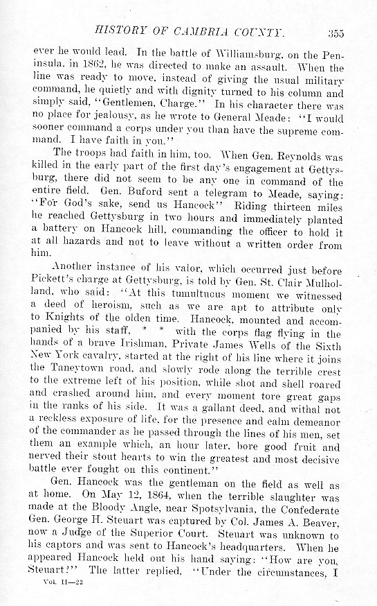 ever he would lead. In the battle of Williamsburg, on the Peninsula, in 1862, he was directed to make an assault. When the line was ready to move, instead of giving the usual military command, he quietly and with dignity turned to his column and simply said, “Gentleman, Charge.” In his character there was no place for jealousy, as he wrote to General Meade: “I would sooner command a corps under you than have the supreme command. I have faith in you.” The troops had faith in him, too. When Gen. Reynolds was killed in the early part of the first day's engagement at Gettysburg, there did not seem to be any one in command of the entire field. Gen. Buford sent a telegram to Meade, saying: “For God's sake, send us Hancock” Riding thirteen miles he reached Gettysburg in two hours and immediately planted a battery on Hancock hill, commanding the officer to hold it at all hazards and not to leave without a written order from him. Another instance of his valor, which occurred just before Pickett's charge at Gettysburg, is told by Gen. St. Clair Mulholland, who said: “At this tumultuous moment we witnessed a deed of heroism, such as we are apt to attribute only to knights of the olden time. Hancock, mounted and accompanied by his staff, * * with the corps flag flying in the hands of a brave Irishman, Private James Wells of the Sixth New York cavalry, started at the right of his line where it joins the Taneytown road, and slowly rode along the terrible crest to the extreme left of his position, while shot and shell roared and crashed around him, and every moment tore great gaps in the ranks of his side. It was a gallant deed, and withal not a reckless exposure of life, for the presence and calm demeanor of the commander as he passed through the lines of his men, set them an example which, an hour later, bore good fruit and nerved their stout hearts to win the greatest and most decisive battle ever fought on this continent.” Gen. Hancock was the gentleman on the field as well as at home. On May 12, 1864, when the terrible slaughter was made at the Bloody Angle, near Spotsylvania, the Confederate Gen. George H. Steuart was captured by Col. James A. Beaver, now a Judge of the Superior Court. Steuart was unknown to his captors and was sent to Hancock's headquarters. When he appeared Hancock held out his hand saying; “How are you, Steuart?” The latter replied, “Under the circumstances, I |