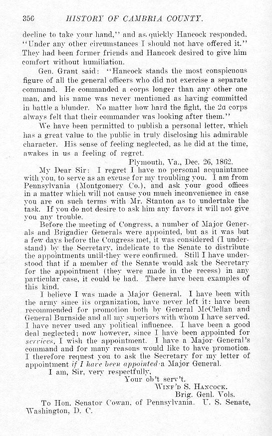 decline to take your hand,” and as quickly Hancock responded, “Under any other circumstances I should not have offered it.” They had been former friends and Hancock desired to give him comfort without humiliation. Gen. Grant said: “Hancock stands the most conspicuous figure of all the general officers who did not exercise a separate command. He commanded a corps longer than any other one man, and his name was never mentioned as having committed in battle a blunder. No matter how hard the fight, the 2d corps always felt that their commander was looking after them.” We have been permitted to publish a personal letter, which has a great value to the public in truly disclosing his admirable character. His sense of feeling neglected, as he did at the time, awakes in us a feeling of regret. Plymouth, Va., Dec. 26, 1862.
