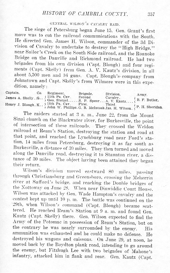 The siege of Petersburg began June 15. Gen. Grant's first move was to cut the railroad communications with the South. He directed Gen. James H. Wilson, commander of the 3d Division of Cavalry to undertake to destroy the “High Bridge,” near Sailor's Creek on the South Side railroad, and the Roanoke Bridge on the Danville and Richmond railroad. He had two brigades from his own division (Capt. Blough) and four regiments (Capt. Skelly) from Gen. A. V. Kautz's division, in all about 5,500 men and 16 guns. Capt. Blough's company from Johnstown and Capt. Skelly's from Wilmore were in this expedition, namely: