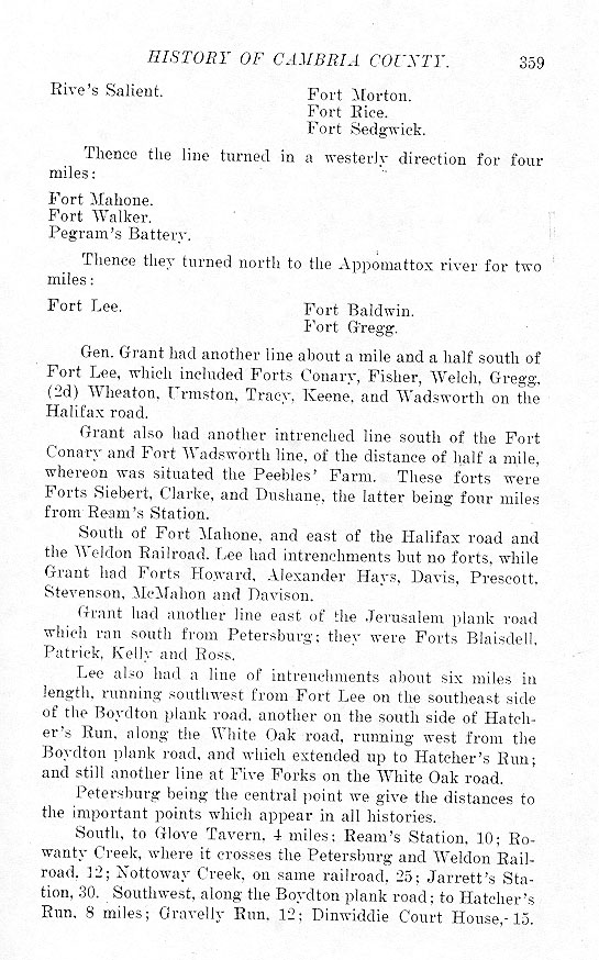 Thence the line turned in a westerly direction for four miles: Fort Mahone. Fort Walker. Pegram's Battery. Thence they turned north to the Appomattox river for two miles: