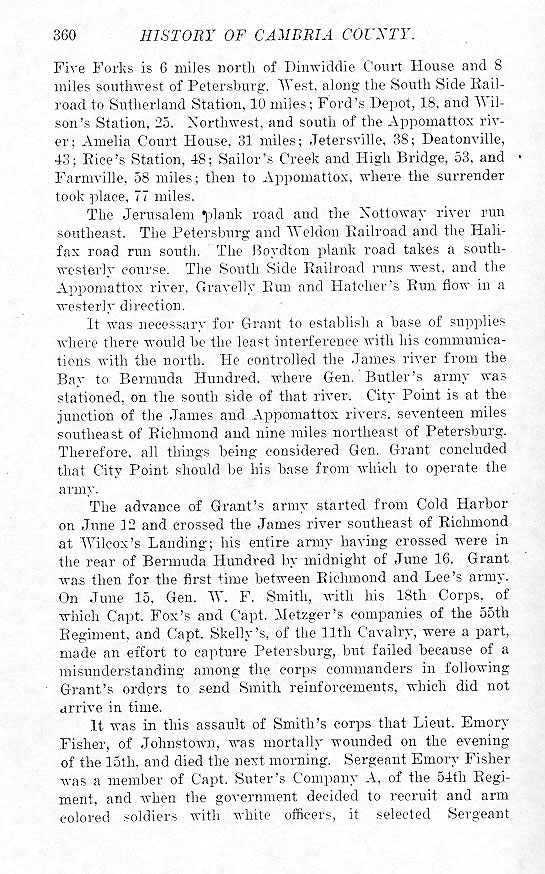 Five Forks is 6 miles north of Dinwiddie Court House and 8 miles southwest of Petersburg. West, along the South Side Railroad to Sutherland Station, 10 miles; Ford's Depot, 18, and Wilson's Station, 25. Northwest, and south of the Appomattox river; Amelia Court House, 31 miles; Jetersville, 38; Deatonville, 43; Rice's Station, 48; Sailor's Creek and High Bridge, 53, and Farmville, 58 miles; then to Appomattox, where the surrender took place, 77 miles. The Jerusalem plank road and the Nottoway river run southeast. The Petersburg and Weldon Railroad and the Halifax road run south. The Boydton plank road takes a southwesterly course. The South Side Railroad runs west, and the Appomattox river, Gravelly Run and Hatcher's Run flow in a westerly direction. It was necessary for Grant to establish a base of supplies where there would be the least interference with his communications with the north. He controlled the James river from the Bay to Bermuda Hundred, where Gen. Butler's army was stationed, on the south side of that river. City Point is at the junction of the James and Appomattox rivers, seventeen miles southeast of Richmond and nine miles northeast of Petersburg. Therefore, all things being considered Gen. Grant concluded that City Point should be his base from which to operate the army. The advance of Grant's army started from Cold Harbor on June 12 and crossed the James river southeast of Richmond at Wilcox's Landing; his entire army having crossed were in the rear of Bermuda Hundred by midnight of June 16. Grant was then for the first time between Richmond and Lee's army. On June 15, Gen. W. F. Smith, with his 18th Corps, of which Capt. Fox's and Capt. Metzger's companies of the 55th Regiment, and Capt. Skelly's, of the 11th Cavalry, were a part, made an effort to capture Petersburg, but failed because of a misunderstanding among the corps commanders in following Grant's orders to send Smith reinforcements, which did not arrive in time. It was in this assault of Smith's corps that Lieut. Emory Fisher, of Johnstown, was mortally wounded on the evening of the 15th, and died the next morning. Sergeant Emory Fisher was a member of Capt. Suter's Company A, of the 54th Regiment, and when the government decided to recruit and arm colored soldiers with white officers, it selected Sergeant |