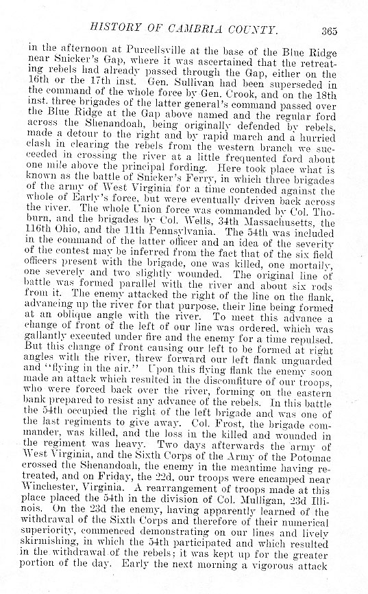 in the afternoon at Purcellsville at the base of the Blue Ridge near Snicker's Gap, where it was ascertained that the retreating rebels had already passed through the Gap, either on the 16th or the 17th inst. Gen. Sullivan had been superseded in the command of the whole force by Gen. Crook, and on the 18th inst. three brigades of the latter general's command passed over the Blue Ridge at the Gap above named and the regular ford across the Shenandoah, being originally defended by rebels, made a detour to the right and by rapid march and a hurried clash in clearing the rebels from the western branch we succeeded in crossing the river at a little frequented ford about one mile above the principal fording. Here took place what is known as the battle of Snicker's Ferry, in which three brigades of the army of West Virginia for a time contended against the whole of Early's force, but were eventually driven back across the river. The whole Union force was commanded by Col. Thoburn, and the brigades by Col. Wells, 34th Massachusetts, the 116th Ohio, and the 11th Pennsylvania. The 54th was included in the command of the latter officer and an idea of the severity of the contest may be inferred from the fact that of the six field officers present with the brigade, one was killed, one mortally, one severely and two slightly wounded. The original line of battle was formed parallel with the river and about six rods from it. The enemy attacked the right of the line on the flank, advancing up the river for that purpose, their line being formed at an oblique angle with the river. To meet this advance a change of front of the left of our line was ordered, which was gallantly executed under fire and the enemy for a time repulsed. But this change of front causing our left to be formed at right angles with the river, threw forward our left flank unguarded and “flying in the air.” Upon this flying flank the enemy soon made an attack which resulted in the discomfiture of our troops, who were forced back over the river, forming on the eastern bank prepared to resist any advance of the rebels. In this battle the 54th occupied the right of the left brigade and was one of the last regiments to give away. Col. Frost, the brigade commander, was killed, and the loss in the killed and wounded in the regiment was heavy. Two days afterwards the army of West Virginia, and the Sixth Corps of the Army of the Potomac crossed the Shenandoah, the enemy in the meantime having retreated, and on Friday, the 22d, our troops were encamped near Winchester, Virginia. A rearrangement of troops made at this place placed the 54th in the division of Col. Mulligan, 23d Illinois. On the 23d the enemy, having apparently learned of the withdrawal of the Sixth Corps and therefore of their numerical superiority, commenced demonstrating on our lines and lively skirmishing, in which the 54th participated and which resulted in the withdrawal of the rebels ; it was kept up for the greater portion of the day. Early the next morning a vigorous attack