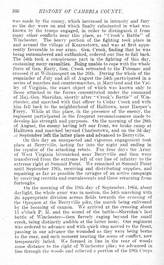 was made by the enemy, which increased in intensity and fury as the day wore on and which finally culminated in what was known by the troops engaged, in order to distinguish it from many other conflicts near this place, as “Crook's Battle” of Winchester. The heavy portion of the fighting took place in and around the village of Kearnstown, and was at first apparently favorable to our arms. Gen. Crook, finding that he was being outnumbered and outflanked, ordered our line to fall back. The 54th took a conspicuous part in the fighting of this day, sustaining many casualties. Being unable to cope with the whole force of Gen. Early, Gen. Crook retreated to the Potomac and crossed it at Williamsport on the 26th. During the whole of the remainder of July and all of August the 54th participated in a series of marches and countermarches, in Maryland and the Valley of Virginia, the exact object of which was known only to those attached to the forces concentrated under the command of Maj.-Gen. Sheridan, shortly after “Crook's Battle” of Winchester, and marched with that officer to Cedar Creek and with him fell back to the neighborhood of Halltown, near Harper's Ferry. While at this place, in the presence of the enemy, the regiment participated in the frequent reconnoissances made to develop his strength and purposes. On the morning of the 28th of August, the enemy having left our front, we broke camp at Halltown and marched beyond Charlestown, and on the 3d day of September left the latter place and advanced to Berryville. On this day an unexpected and vigorous engagement took place at Berryville, lasting far into the night and ending in the repulse of the attacking rebels. For four days the Army of West Virginia bivouacked near Berryville and then were transferred from the extreme left of our line of infantry to the extreme right at Summit Point. We remained at Summit Point until September 19th, receiving and distributing supplies, and repairing as far as possible the ravages of an active campaign by receiving recruits and convalescents and those returning from furloughs. On the morning of the 19th day of September, 1864, about daylight, the whole army was in motion, the 54th marching with its appropriate division across fields towards the crossing of the Opequon at the Berryville pike, the march being enlivened by the booming of the cannon. We arrived at the crossing about 11 o'clock P. M. and the sound of the battle - Sheridan's last battle of Winchester - then fiercely raging beyond the small creek, being distinctly audible at the latter hour. Our regiment was ordered to advance and with quick step moved to the front, passing in our advance the wounded as they were being borne to the rear, and each moment nearing the scene of conflict, now temporarily lulled. We formed in line in the rear of woods some distance to the right of Winchester pike; we advanced in line through the woods and relieved a portion of the 19th Corps |