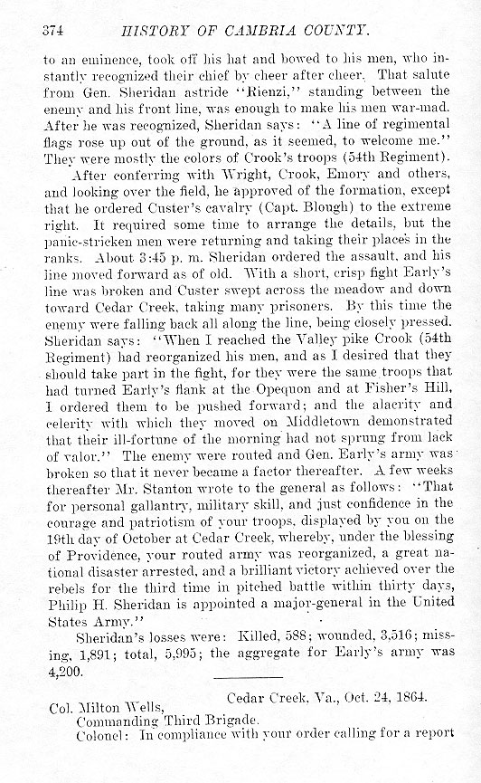 to an eminence, took off his hat and bowed to his men, who instantly recognized their chief by cheer after cheer. That salute from Gen. Sheridan astride “Rienzi,” standing between the enemy and his front line, was enough to make his men war-mad. After he was recognized, Sheridan says : “A line of regimental flags rose up out of the ground, as it seemed, to welcome me.” They were mostly the colors of Crook's troops (54th Regiment). After conferring with Wright, Crook, Emory and others, and looking over the field, he approved of the formation, except that he ordered Custer's cavalry (Capt. Blough) to the extreme right. It required some time to arrange the details, but the panic-stricken men were returning and taking their places in the ranks. About 3:45 p. m. Sheridan ordered the assault, and his line moved forward as of old. With a short, crisp fight Early's line was broken and Custer swept across the meadow and down toward Cedar Creek, taking many prisoners. By this time the enemy were falling back all along the line, being closely pressed. Sheridan says : “When I reached the Valley pike Crook (54th Regiment) had reorganized his men, and as I desired that they should take part in the fight, for they were the same troops that had turned Early's flank at the Opequon and at Fisher's Hill, I ordered them to be pushed forward ; and the alacrity and celerity with which they moved on Middletown demonstrated that their ill-fortune of the morning had not sprung from lack of valor.” The enemy were routed and Gen. Early's army was broken so that it never became a factor thereafter. A few weeks thereafter Mr. Stanton wrote to the general as follows : “That for personal gallantry, military skill, and just confidence in the courage and patriotism of your troops, displayed by you on the 19th day of October at Cedar Creek, whereby, under the blessing of Providence, your routed army was reorganized, a great national disaster arrested, and a brilliant victory achieved over the rebels for the third time in pitched battle within thirty days, Philip H. Sheridan is appointed a major-general in the United States Army.” Sheridan's losses were : Killed 588 ; wounded, 3,516 ; missing, 1,891 ; total, 5,995 ; the aggregate for Early's army was 4,200. Cedar Creek, Va., Oct. 24, 1864.