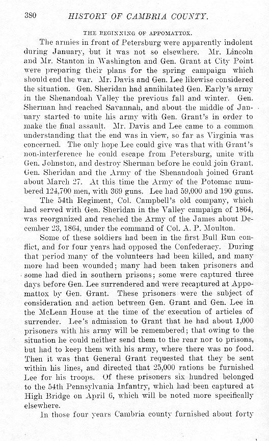 The armies in front of Petersburg were apparently indolent during January, but it was not so elsewhere. Mr. Lincoln and Mr. Stanton in Washington and Gen. Grant at City Point were preparing their plans for the spring campaign which should end the war. Mr. Davis and Gen. Lee likewise considered the situation. Gen. Sheridan had annihilated Gen. Early's army in the Shenandoah Valley the previous fall and winter. Gen. Sherman had reached Savannah, and about the middle of January stated to unite his army with Gen. Grant's in order to make the final assault. Mr. Davis and Lee came to a common understanding that the end was in view, so far as Virginia was concerned. The only hope Lee could give was that with Grant's non-interference he could escape from Petersburg, unite with Gen. Johnston, and destroy Sherman before he could join Grant. Gen. Sheridan and the Army of the Shenandoah joined Grant about March 27. At this time the Army of the Potomac numbered 124,700 men, with 369 guns. Lee had 59,000 and 190 guns. The 54th Regiment, Col. Campbell's old company, which had served with Gen. Sheridan in the Valley campaign of 1864, was reorganized and reached the Army of the James about December 23, 1864, under the command of Col. A. P. Moulton. Some of these soldiers had been in the first Bull Run conflict, and for four years had opposed the Confederacy. During that period many of the volunteers had been killed, and many more had been wounded; many had been taken prisoners and some had died in southern prisons; some were captured three days before Gen. Lee surrendered and were recaptured at Appomattox by Gen. Grant. These prisoners were the subject of consideration and action between Gen. Grant and Gen. Lee in the McLean House at the time of the execution of articles of surrender. Lee's admission to Grant that he had about 1,000 prisoners with his army will be remembered; that owning to the situation he could neither send them to the rear nor to prisons, but had to keep them with his army, where there was no food. Then it was that General Grant requested that they be sent within his lines, and directed that 25,000 rations be furnished Lee for his troops. Of these prisoners six hundred belonged to the 54th Pennsylvania Infantry, which had been captured at High Bridge on April 6, which will be noted more specifically elsewhere. In those four years Cambria county furnished about forty |
