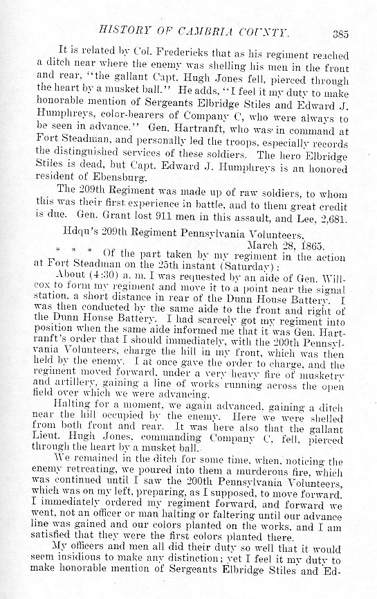 It is related by Col. Fredericks that as his regiment reached a ditch near where the enemy was shelling his men in the front and rear, “the gallant Capt. Hugh Jones fell, pierced through the heart by a musket ball.” He adds, “I feel it my duty to make honorable mention of Sergeants Elbridge Stiles and Edward J. Humphreys, color-bearers of Company C, who were always to be seen in advance.” Gen. Hartranft, who was in command at Fort Steadman, and personally led the troops, especially records the distinguished services of these soldiers. The hero Elbridge Stiles is dead, but Capt. Edward J. Humphreys is an honored resident of Ebensburg. The 209th Regiment was made up of raw soldiers, to whom this was their first experience in battle, and to them great credit is due. Gen. Grant lost 911 men in this assault, and Lee, 2,681. Hdqu's 209th Regiment Pennsylvania Volunteers.