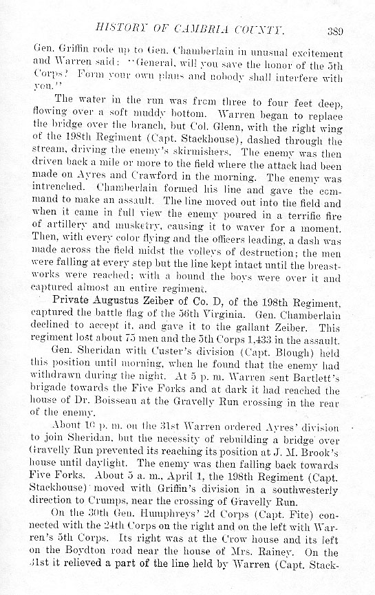 Gen. Griffin rode up to Gen. Chamberlain in unusual excitement and Warren said: “General, will you save the honor of the 5th Corps? Form your own plans and nobody shall interfere with you.” The water in the run was from three to four feet deep, flowing over a soft muddy bottom. Warren began to replace the bridge over the branch, but Col. Glenn, with the right wing of the 198th Regiment (Capt. Stackhouse), dashed through the stream, driving the enemy's skirmishers. The enemy was then driven back a mile or more to the field where the attack had been made on Ayres and Crawford in the morning. The enemy was intrenched. Chamberlain formed his line and gave the command to make an assault. The line moved out into the field and when it came in full view the enemy poured in a terrific fire of artillery and musketry, causing it to waver for a moment. Then, with every color flying and the officers leading, a dash was made across the field midst the volleys of destruction; the men were falling at every step but the line kept intact until the breastworks were reached; with a bound the boys were over it and captured almost an entire regiment. Private Augustus Zeiber of Co. D, of the 198th Regiment, captured the battle flag of the 56th Virginia. Gen. Chamberlain declined to accept it, and gave it to the gallant Zeiber. This regiment lost about 75 men and the 5th Corps 1,433 in the assault. Gen. Sheridan with Custer's division (Capt. Blough) held this position until morning, when he found that the enemy had withdrawn during the night. At 5 p. m. Warren sent Bartlett's brigade towards the Dive Forks and at dark it had reached the house of Dr. Boisseau at the Gravelly Run crossing in the rear of the enemy. About 10 p. m. on the 31st Warren ordered Ayres' division to join Sheridan, but the necessity of rebuilding a bridge over Gravelly Run prevented its reaching its position at J. M. Brook's house until daylight. The enemy was then falling back towards Five Forks. About 5 a. m., April 1, the 198th Regiment (Capt. Stackhouse) moved with Griffin's division in a southwesterly direction to Crumps, near the crossing of Gravelly Run. On the 30th Gen. Humphreys' 2d Corps (Capt. Fite) connected with the 24th Corps on the right and on the left with Warren's 5th Corps. Its right was at the Crow house and its left on the Boydton road near the house of Mrs. Rainey. On the 31st it relieved a part of the line held by Warren (Capt. Stack- |