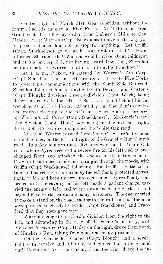 On the night of March 31st, Gen. Sheridan, without infantry, had his cavalry at Five Forks. At 10:15 p. m. Gen. Grant sent the following order from Dabney's Mills to Gen. Meade: "Let Warren (Capt. Stackhouse) move in the way you propose, and urge him not to stop for anything. Let Griffin (Capt. Stackhouse) go on as he was first directed." Grant informed Sheridan that Warren would arrive about midnight, and at 3 a. m., April 1, not having heard from him, Sheridan sent a dispatch to Warren to attack "at daylight anyhow." At 1 a. m., Pickett, threatened by Warren's 5th Corps (Capt. Stackhouse) on his left, ordered a retreat to Five Forks to protect his communications with the South Side Railroad. Sheridan followed him at daylight with Devin's and Custer's (Capt. Blough) divisions, Crook's division (Capt. Black) being thrown on roads to the left. Pickett was found behind his intrenchments at Five Forks. About 1 p. m. Sheridan's cavalry had worked close up to Pickett's lines, when Sheridan ordered up Warren's 5th Corps (Capt. Stackhouse). McKenzie's cavalry division (Capt. Hads) advancing on the extreme right, drove Robert's cavalry and gained the White Oak road. At 4 p. m. Warren formed Ayres' and Crawford's divisions in double lines, on the left and right of the Gravelly Run Church road. In a few minutes these divisions were on the White Oak road, where Ayres received a severe fire on his left and at once changed front and attacked the enemy in its entrenchments. Crawford continued to advance straight through the woods, with Griffin (Capt. Stackhouse) following. But Griffin saw the situation, and marching his division by the left flank, protected Ayres' flank, which had been thrown into confusion. Ayres finally connected with the cavalry on his left, made a gallant charge, carried the enemy's left, and swept down inside its works to and beyond Five Forks, capturing many prisoners. The enemy tried to make a stand on the road leading to the railroad, but the men were pursued so closely by Griffin (Capt. Stackhouse) and Crawford that they soon gave way. Warren changed Crawford's division from the right to the left, and advancing in the rear of the enemy's infantry, with McKenzie's cavalry (Capt. Hads) on the right, drove them north of Hatcher's Run, taking four guns and many prisoners. On the extreme left Custer (Capt. Blough) had a severe fight with cavalry and infantry, and gained but little ground until Devin and Ayres advancing from the rear, drove the |