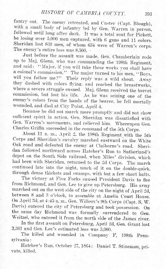infantry out. The enemy retreated, and Custer (Capt. Blough), with a small body of infantry led by Gen. Warren in person, followed until long after dark. It was a total rout for Pickett, he losing over 5,000 men captured, with 6 guns and 11 colors. Sheridan lost 830 men, of whom 634 were of Warren's corps. The enemy's entire loss was 8,500. Just before the assault was made, Gen. Chamberlain rode up to Maj. Glenn, who was commanding the 198th Regiment, and said: "Major, if you will take those works you shall have a colonel's commission." The major turned to his men, "Boys, will you follow me?" Their reply was a wild shout. Away they dashed with colors flying, and reached the breastworks, where a severe struggle ensued. Maj. Glenn received the brevet commission, but lost his life. As he was seizing one of the enemy's colors from the hands of the bearer, he fell mortally wounded, and died at City Point, April 4. Because he did not march more promptly and did not show sufficient spirit in action, Gen. Sheridan was dissatisfied with Gen. Warren's movements, and relieved him. Whereupon Gen. Charles Griffin succeeded in the command of the 5th Corps. About 11 a. m., April 2, the 198th Regiment with the 5th Corps and Sheridan's cavalry marched eastward on the White Oak road and defeated the enemy at Claiborne's road. Sheridan followed northward across Hatcher's Run to Sutherland's depot on the South Side railroad, when Miles' division, which had been with Sheridan, returned to the 2d Corps. The march continued late into the night, much of it on the double-quick, through dense thickets and swamps, with but a few short halts. The victory at Five Forks caused President Davis to flee from Richmond, and Gen. Lee to give up Petersburg. His army marched out on the west side of the city on the night of April 2d, between 8 and 3 o'clock, to assemble at Amelia Court House. On April 3d, at 4:45 a. m., Gen. Willcox's 9th Corps (Capt. S. W. Davis) entered the city of Petersburg and took possession. On the same day Richmond was formally surrendered to Gen. Weitzel, who entered it from the north side of the James river. In the first assault on Petersburg, April 2d, Gen. Grant lost 3,361 and Gen. Lee's estimated loss was 3,000. The killed and wounded in Company F, 198th Pennsylvania: Hatcher's Run October 27, 1864: Daniel T. Stineman, private killed. |