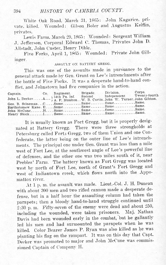 It is usually known as Fort Gregg, but it is properly designated at Battery Gregg. There were three strongholds at Petersburg called Forts Gregg, two of them Union and one Confederate, the latter being on the outer line of Lee's intrenchments. The principal one under Gen. Grant was less than a mile west of Fort Lee, at the southwest angle of Lee's powerful line of defenses, and the other one was two miles south of it, near Peebles' Farm. The battery known as Fort Gregg was located west by north of Fort Lee, north of Grant's Fort Gregg and west of Indiantown creek, which flows north into the Appomattox river. At 1 p. m. the assault was made. Lieut.-Col. J. H. Duncan with about 300 men and two rifled cannon made a desperate defense, but in a half hour the assaulting column had taken the parapets; then a bloody hand-to-hand struggle continued until 2:30 p. m. Fifty-seven of the enemy were dead and about 250, including the wounded, were taken prisoners. Maj. Nathan Davis had been wounded early in the combat, but he gallantly led his men and had surmounted the parapets when he was killed. Color Bearer James P. Ryan was also killed as he was planting his flag on the rampart. It was on this day that Capt. Decker was promoted to major and John McCune was commissioned Captain of Company H. |