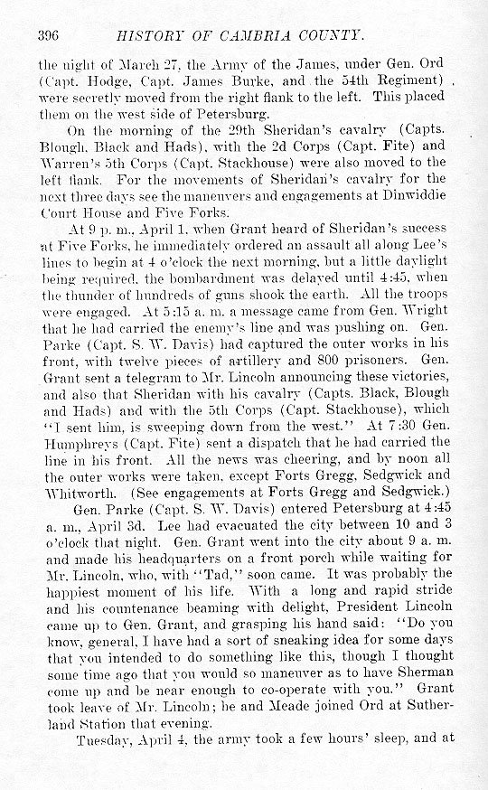 the night of March 27, the Army of the James, under Gen. Ord (Capt. Hodge, Capt. James Burke, and the 54th Regiment) were secretly moved from the right flank to the left. This placed them on the west side of Petersburg. On the morning of the 29th Sheridan's cavalry (Capts. Blough, Black and Hads), with the 2d Corps (Capt. Fite) and Warren's 5th Corps (Capt. Stackhouse) were also moved to the left flank. For the movements of Sheridan's cavalry for the next three days see the maneuvers and engagements at Dinwiddie Court House and Five Forks. At 9 p. m., April 1, when Grant heard of Sheridan's success at Five Forks, he immediately ordered an assault all along Lee's lines to begin at 4 o'clock the next morning, but a little daylight being required, the bombardment was delayed until 4:45, when the thunder of hundreds of guns shook the earth. All the troops were engaged. At 5:15 a. m. a message came from Gen. Wright that he had carried the enemy's line and was pushing on. Gen Parke (Capt. S. W. Davis) had captured the outer works in his front, with twelve pieces of artillery and 800 prisoners. Gen. Grant sent a telegram to Mr. Lincoln announcing these victories, and also that Sheridan with his cavalry (Capts. Black, Blough and Hads) and with the 5th Corps ( Capt. Stackhouse), which "I sent him, is sweeping down from the west." At 7:30 Gen. Humphreys (Capt. Fite) sent a dispatch that he had carried the line in his front. All the news was cheering, and by noon all the outer works were taken, except Forts Gregg, Sedgwick and Whitworth. (See engagements at Forts Gregg and Sedgwick.) Gen. Parke (Capt. S. W. Davis) entered Petersburg at 4:45 a. m., April 3d. Lee had evacuated the city between 10 and 3 o'clock that night. Gen. Grant went into the city about 9 a. m. and made his headquarters on a front porch while waiting for Mr. Lincoln, who, with "Tad," soon came. It was probably the happiest moment of his life. With a long and rapid stride and his countenance beaming with delight, President Lincoln came up to Gen. Grant, and grasping his hand said: "Do you know, general, I have had a sort of sneaking idea for some days that you intended to do something like this, though I thought some time ago that you would so maneuver as to have Sherman come up and be near enough to co-operate with you." Grant took leave of Mr. Lincoln; he and Meade joined Ord at Sutherland Station that evening. Tuesday, April 4, the army took a few hours' sleep, and at |