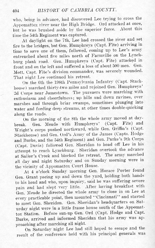 who, being in advance, had discovered Lee trying to cross the Appomattox river near the High Bridge. Ord attacked at once, but he was brushed aside by the superior force. About this time the 54th Regiment was captured. At daylight on the 7th, Lee had crossed the river and set fire to the bridges, but Gen. Humphreys (Capt. Fite) arriving in time to save one of them, followed, coming up to Lee's army entrenched about five miles north of Farmville on the Lynchburg plank road. Gen. Humphreys (Capt. Fite) attacked in front and on the left and suffered a loss of about 500 men. Gen Mott, Capt. Fite's division commander, was severly wounded. That night Lee continued his retreat. On the 6th the 198th Pennsylvania Infantry (Capt. Stackhouse) marched thirty-two miles and rejoined Gen. Humphreys' 2d Corps near Jamestown. The pursuers were marching with enthusiasm and cheerfulness; up hills and down ravines, over marshes and through briar swamps, sometimes plunging into water and fording deep streams, at other times double-quicking along the roads. On the morning of the 8th the whole army moved at daybreak. Gen Meade with Humphreys' (Capt. Fite) and Wright's corps pushed northward, while Gen. Griffin's (Capt. Stackhouse) and Gen. Ord's Army of the James (Capts. Hodge and Burke, and the 54th Regiment) and Gen. Parke's 9th Corps (Capt. Davis) followed Gen. Sheridan to head off Lee in his attempt to reach Lynchburg. Sheridan overtook the advance at Sailor's Creek and blocked the retreat. The army marched all day and night Saturday and on Sunday morning were in the vicinity of Appomattox Court House. At 4 o'clock Sunday morning Gen. Horace Porter found Gen. Grant pacing up and down the yard, holding both hands to his head and who, lupon inquiry, said he was suffering severe pain and had slept very little. After having breakfast with Gen Meade he directed the whole army to close in on Lee at every practicable point, then mounted "Cincinnati" and started to meet Gen Sheridan. Gen Sheridan's headquarters on Saturday night were in a little frame house south of the Appomattox Station. Before sun-up Gen. Ord (Capt. Hodge and Capt. Burke, arrived and informed Sheridan that his army was approaching after marching all night. On Saturday night Lee had still hoped to escape and the result of the conference held with his principal generals was |