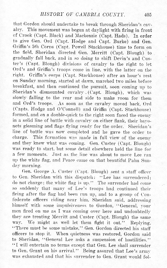 that Gordon should undertake to break through Sheridan's cavalry. This movement was begun at daylight with firing in front of Crook (Capt. Black) and Mackenzie (Capt. Hads). In order to give Gen. Ord (Capt. Hodge and Capt. Burke) and Gen. Griffin's 5th Corps (Capt. Powell Stackhouse) time to form on the field, Sheridan directed Gen. Merritt (Capt. Blough) to gradually fall back, and in so doing to shift Devin's and Custer's (Capt. Blough) divisions of cavalry to the right to let Ord's and Griffin's troops come in line, with the latter on the right. Griffin's corps (Capt. Stackhouse) after an hour's rest on Sunday morning, started at dawn, marched two miles before breakfast, and then continued the pursuit, soon coming up to Sheridan's dismounted cavalry. (Capt. Blough), which was slowly falling to the rear and side to make room for them and Ord's troops. As soon as the cavalry moved back, Ord (Capts. Hodge and O'Connell) and Griffin (Capt. Stackhouse) formed, and on a double-quick to the right soon faced the enemy in a solid line of battle with cavalry on either flank, their bayonets gleaming and flags flying ready for the order. Sheridan's line of battle was now completed and he gave the order to charge. This formation was made in full view of the enemy and they knew what was coming. Gen. Custer (Capt. Blough) was ready to start, but some detail elsewhere held the line for a few moments. Just as the line was about to move Lee ran up the white flag, and Peace came on that beautiful Palm Sunday morning.